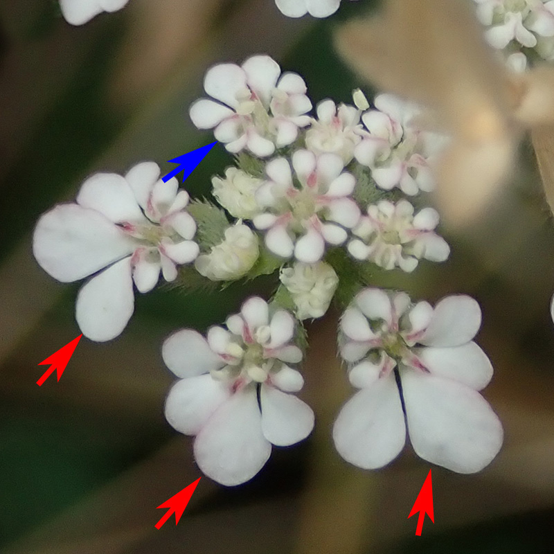 Fleurs externes (flèches rouges) avec le pétale externes à lobes plus gros, fleurs internes à pétales égaux (flèche bleue)