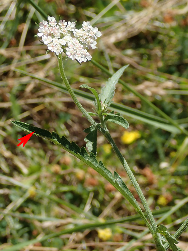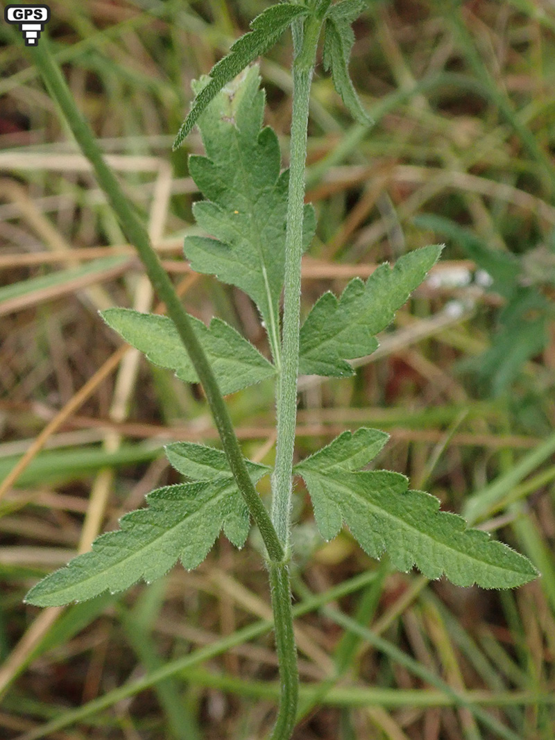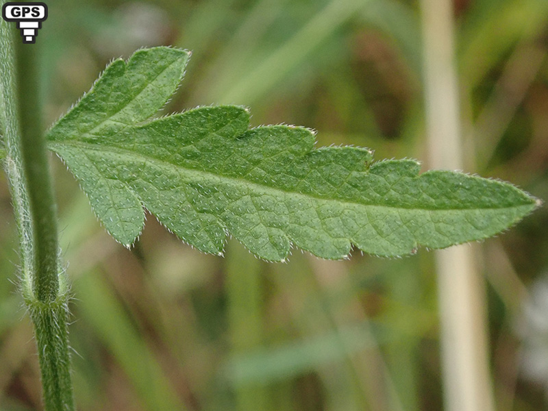Feuilles velues- scabres, pennatiséquées, les inférieures avec de cinq à sept segments oblongs, incisés - crénelés, les moyennes et les supérieures à segment terminal longuement lancéolé et incisé - denté