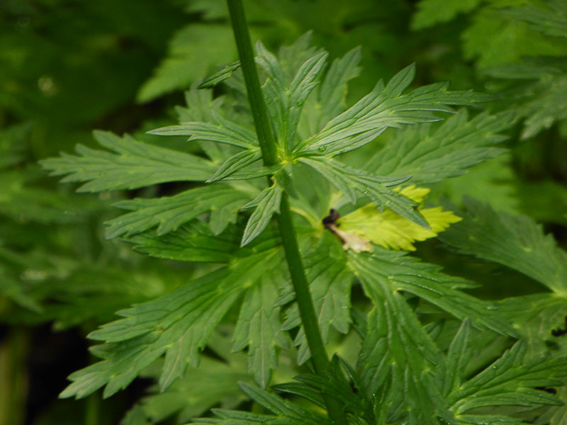 Feuilles palmatiséquées avec des lobes trifides dentés, réparties sur le bas de la tige.