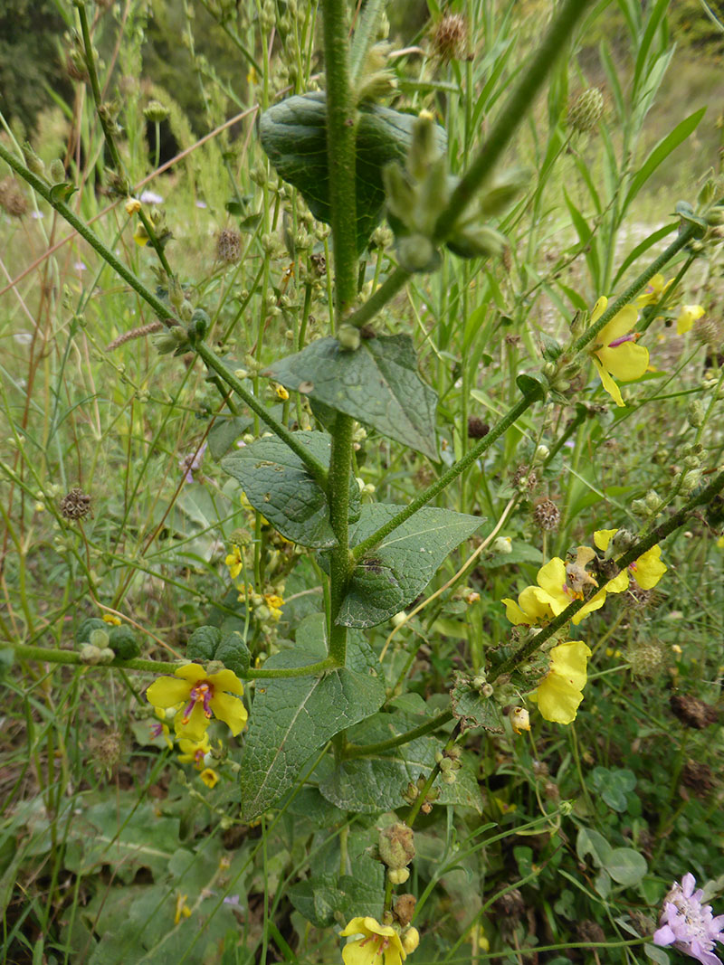 La molène blattaire est une plante bisannuelle, souvent rameuse, qui croît dans les endroits incultes, les champs et au bord des chemins, un peu partout en France. Ses tiges grêles sont garnies de petits poils glanduleux alors que les feuilles sont presque glabres. Les supérieures, crénelées ou dentées, sont sessiles et embrassent un peu la tige par leur base ; les inférieures et aussi parfois les feuilles moyennes, ont souvent un court pétiole et leur limbe peut être plus ou moins profondément denté, découpé ou divisé. Les fleurs sont groupées en grappes lâches. Le calice à divisions étroites, aiguës à leur sommet est largement plus petit que la corolle jaune à cinq pétales étalés presque dans le même plan. Les étamines ont leur filet couvert de poils violets, et leur anthère orange en forme de spatule. Elle est très souvent rameuse. Les boutons floraux sont souvent rougeâtres. C'est une plante à tiges plus ou moins anguleusesà racine principale développée. Elle préfère les sols argileux et frais même en altitude dans des bois clairs.La plante passe pour éloigner les mites, d'où l'origine de plusieurs de ses noms vernaculaires, ses feuilles supérieures ne sont pas embrassantes.