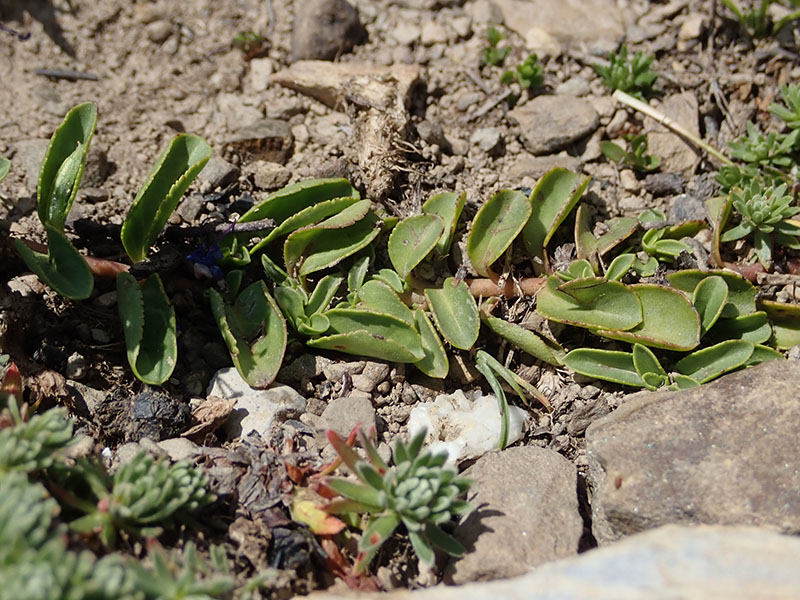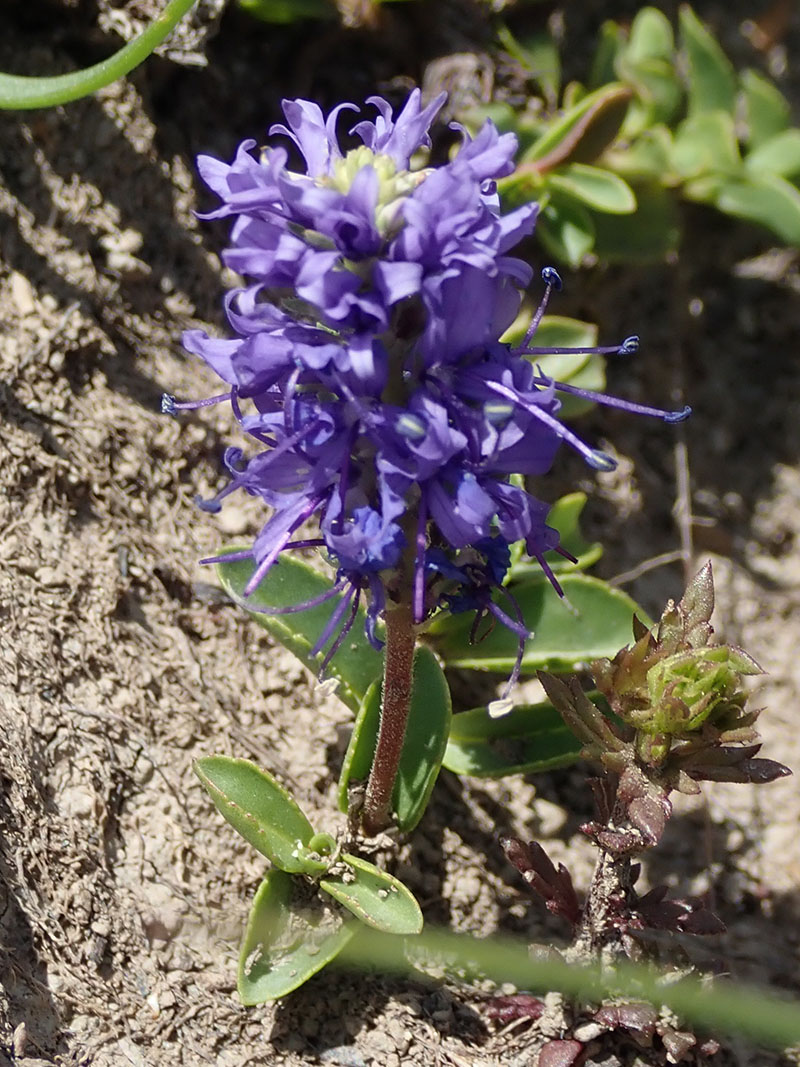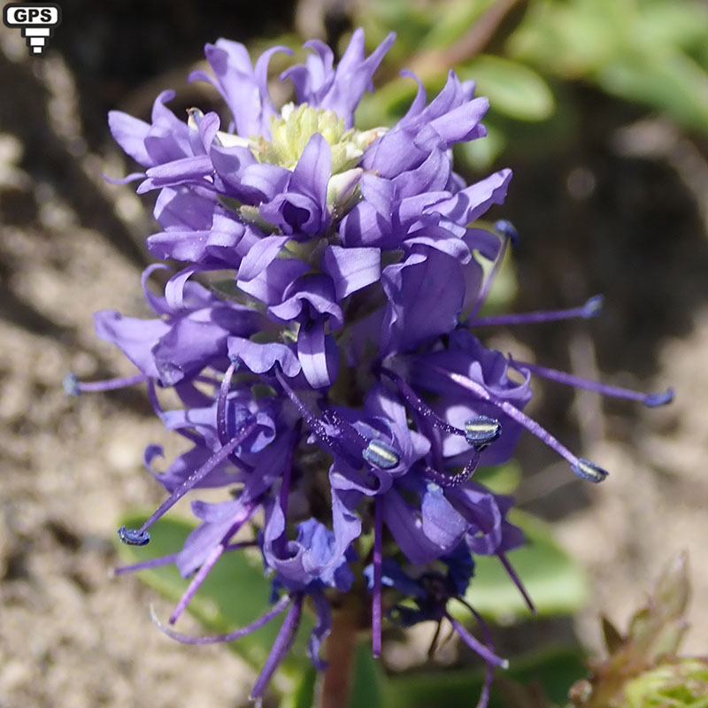 Cette belle véronique décore les pelouses et les rocailles des alpages, sur des terrains plutôt acides. Elle produit de belles grappes de fleurs bleu foncé et brillantes. Les tiges, ligneuses dans leur partie inférieure et mesurant de 10 à 40 cm de longs, sont rampantes et seule l'inflorescence est dressée au bout d'un pédoncule assez long. Les grappes sont très serrées avec des fleurs munies de deux étamines et d'un style saillants. Chaque fleur est portée par un pédoncule cotonneux avec un calice à 4 divisions ovales ; la corolle est quatre à cinq fois plus grande que le calice. C'est une plante vivace qui se multiplie par des bourgeons issus de la tige souterraine.