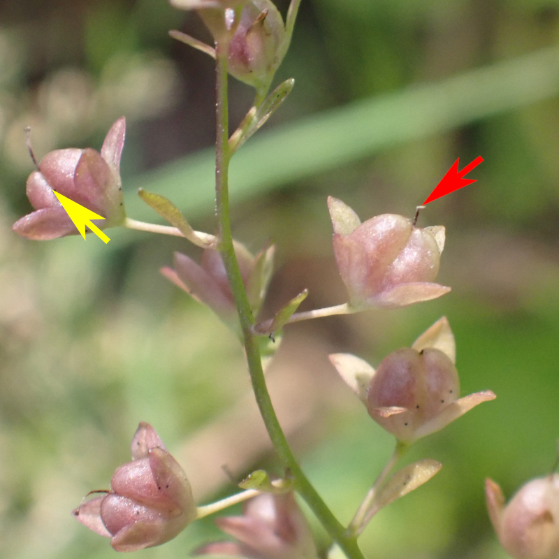 Fruit globuleux échancré au sommet (flèche jaune), style persistant (2mm environ flèche rouge)