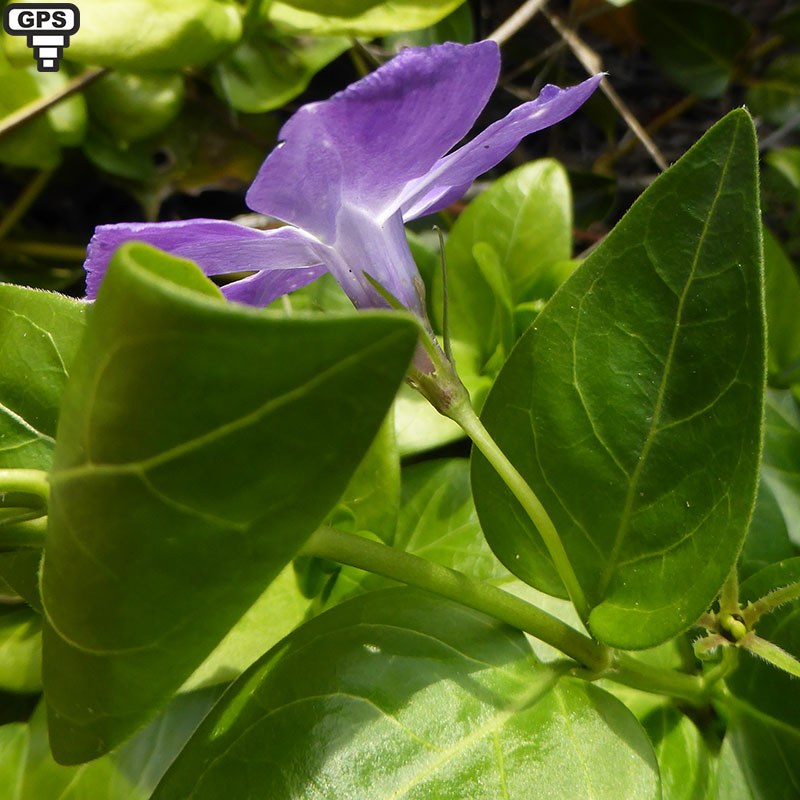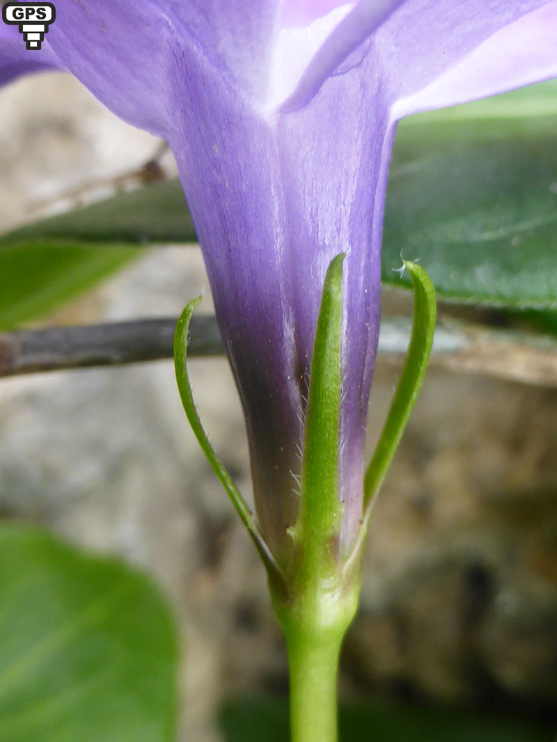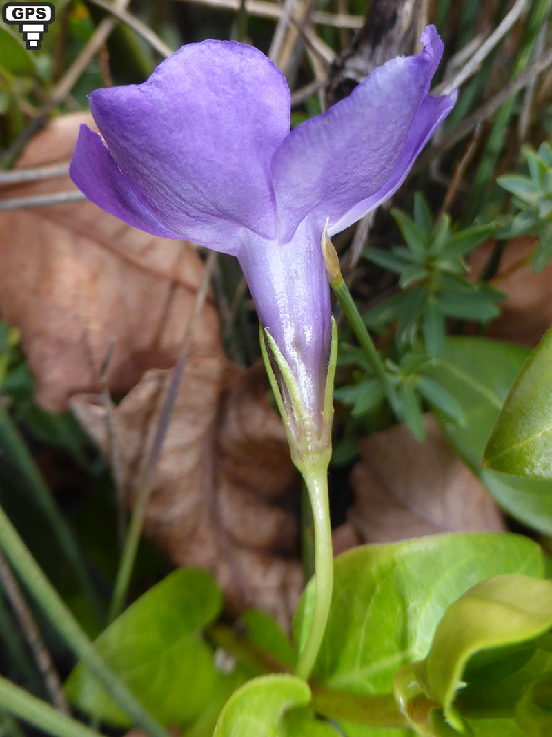 Plante vivace des haies, fossés, lieux ombragées, de la région méditerranéenne, la grande pervenche produit des tiges florifères rampantes, longues de 30 à 50 cm de long. Elle se reconnaît à ses feuilles ovales persistantes, un peu en coeur, à ses grandes fleurs violettes avec un calice à sépales étroits et long et dont les bords sont poilus et ciliés, celui-ci dépassant la moitié du tube de la fleur. Elle naturalisée en région méditerranéenne et subspontanée ailleurs en France.