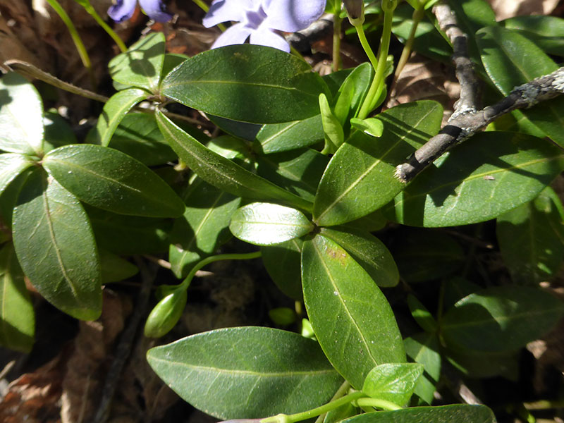 Plante vivace, glabre à tiges persistantes rampantes et radicantes (un à deux mètres de longueur), la petite pervenche préfère les lieux ombragés (bois, haies) plutôt calcaires. Les rameaux florifères sont dressés et ne portent qu’une, deux ou trois fleurs. Celle-ci sont solitaires au bout d'un pédoncule assez allongé et partant de l'aisselle des feuilles. Celles-ci sont opposées, luisantes, à nervure principale très marquée et à nervures secondaires peu apparentes. Le calice est glabre avec des sépales n'atteignant pas la moitié de la longueur du tube de la corolle, les lobes de celle-ci sont coupés en coin, un peu obliquement. Elle est commune dans toute la France.Plante astringeante, diurétique, dépurative, tonique et vulnéraire. Elle doit toutefois être utilisée avec prudence car elle serait cancérigène. (Wikipedia)