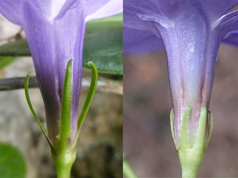 On différencie la grande pervenche de la petite pervenche par ses fleurs plus grandes au bout de pédoncules plus longs, par ses sépales qui dépassent la moitié de la corolle et par la présence de poils sur ceux-ci (voir photo des calices). Les feuilles de la grande pervenche sont plus larges et presque en coeur.