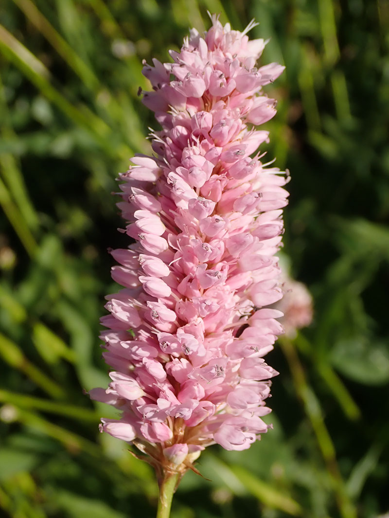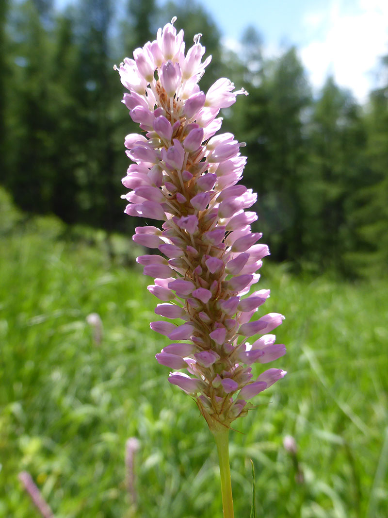 La renouée bistorte est une plante vivace que l'on rencontre dans les prés humides et les terrains marécageux, dans une grande partie de la France métropolitaine mais elle n'est vraiment abondante qu'à l'étage montagnard et à l'étage subalpin dans les prés de fauche ou dans les prairies alpines. La tige florifère est dressée, les feuilles, vertes et glabres sur la face supérieure, sont glauques et faiblement duveteuses sur la face inférieure. Elles présentent un ochréa qui entoure la tige. Les feuilles inférieures ont un long pétiole et un limbe oblong, obtus au sommet, qui se rétrécit brusquement à la base et se continue en 2 ailes de chaque côté du pétiole. Les feuilles supérieures sont sessiles, aiguës au sommet. Elle produit des inflorescences en épis terminaux cylindriques et denses longs de 30 à 90 mm. Les fleurs sont blanchâtres à rosâtres, à 5 tépales, 8 étamines et 3 styles. La plante se multiplie par les nombreux rejets issus de sa tige souterraine. Ces derniers, d'abord grêles et horizontaux, grossissent et se redressent formant autant de tiges aériennes qui ne deviendront libres qu'au bout de plusieurs années.Différentes applications médicinales sont rapportées dans les traditions populaires : Les feuilles écrasées ont été considérées comme hémostatiques sur les blessures et sont censées être vulnéraires. Le rhizome macéré et utilisé en bains de bouche a été préconisé contre les gingivites, les angines, les aphtes. La poudre de racines prise par le nez a été utilisée pour arrêter les saignements... (Wikipedia)