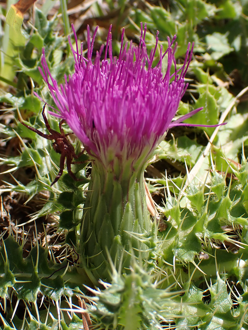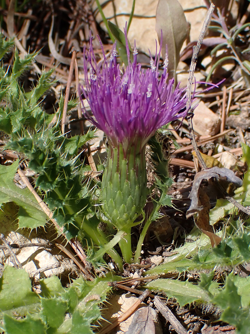 Le cirse acaule est une plante vivace à tige florale très courte poussant dans les champs en friche, sur les coteaux, dans les endroits secs dans presque toute la France. Les feuilles allongées et glabres sont vertes sur les deux faces, elles sont marquées par une nervure longitudinale plus claire et forment une sorte de rosette tout autour de la base de la tige. Leur limbe pennatipartite est bordé d'épines très piquantes. La tige se termine par un seul capitule ou plus rarement 2 à 3 capitules groupés. L'involucre est de forme ovoïde sans poils, à bractées en pointe avec une petite épine au sommet. Les corolles purpurines ont le tube plus long que les dents. Les fruits mûrs sont blanchâtres. La tige souterraine est robuste et munie de racines adventives peu nombreuses devenant ligneuses.