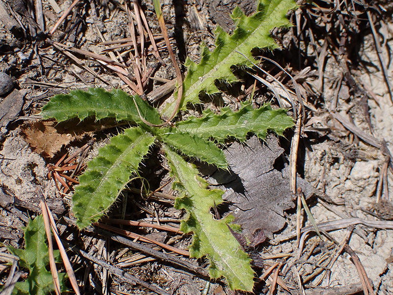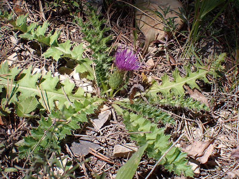 Feuilles glabres en dessous, pennatipartites à bords épineux, les radicales pétiolées, les caulinaires atténuées à la base, sessiles, non embrassantes