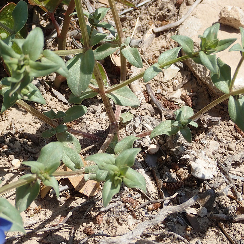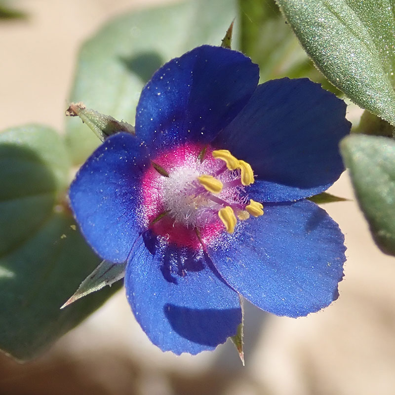 Le mouron bleu est une plante annuelle assez petite que l'on rencontre dans les lieux incultes, les friches et les lieux secs et ensoleillés. La tige principale se divise en nombreux rameaux couchés sur le sol et redressés sur leur extrémité. Ses feuilles sont opposées, ovales-lancéolées et assez longues (de 2 à 2,5 cm de longueur). Leur couleur est vert-blanchâtre un peu glauque et elles sont couvertes de taches brunâtres sur leur face inférieure. La corolle des fleurs est bleu-vif, avec 5 pétales denticulés sur l'extérieur (nettement plus denticulés que pour le mouron des champs). Elle dépasse un peu le calice ; celui-ci présente des sépales lancéolés, acuminés et bien individualisés jusqu'à sa base. Les pédoncules sont généralement plus courts ou égalent les feuilles correspondantes (différence avec le mourron des champs, pour qui les pédoncules sont bien plus longs que la feuille à l'aisselle de laquelle ils sont issus). Le fruit mûr est ovoïde, mat et marqué de 6 à 10 stries.Plante toxique