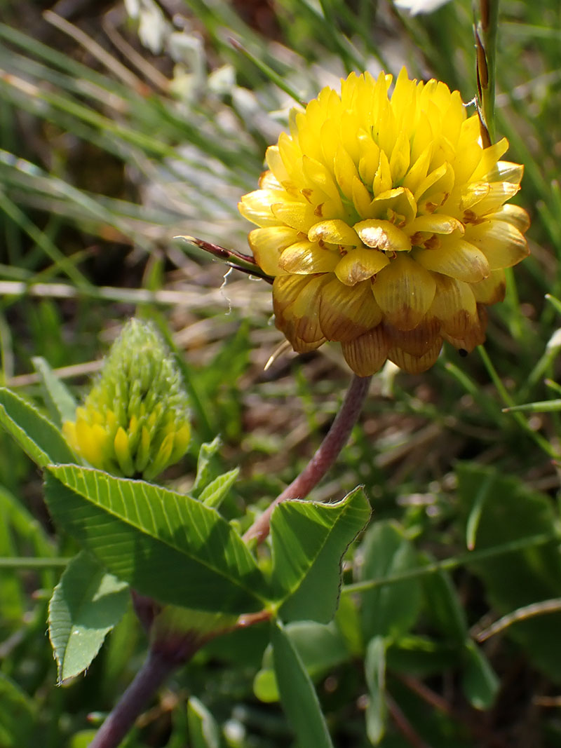 Le trèfle bai est une jolie plante que l'on trouve exclusivement dans les montagnes à l'étage subalpin et à l'étage alpin, entre les rochers, dans les prés, à la lisière des forêts ou dans les zones marécageuses. Les follioles des feuilles sont dentées uniquement dans leur partie supérieure et aucune d'elles n'est pétiolulées. Les fleurs sont groupées en une tête globuleuse ou ovoïde dense qui forme une inflorescence d'un beau jaune d'or devenant brune en fin de floraison. L'étendard est sillonné en long et réfléchi en fin de de floraison. Le style persiste au sommet du fruit et a une longueur égale à la moitié de ce dernier. C'est une plante glabre annuelle ou plus souvent vivace. La souche vivace produit des tiges souterraines donnant des tiges fleuries et des tiges courtes portant seulement une rosette de feuilles.