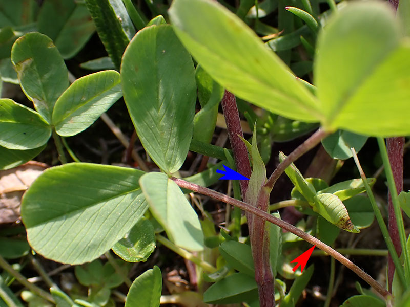 Stipules lancéolées-aiguës (flèche bleue), plus courtes que le long pétiole des feuilles (flèche rouge)