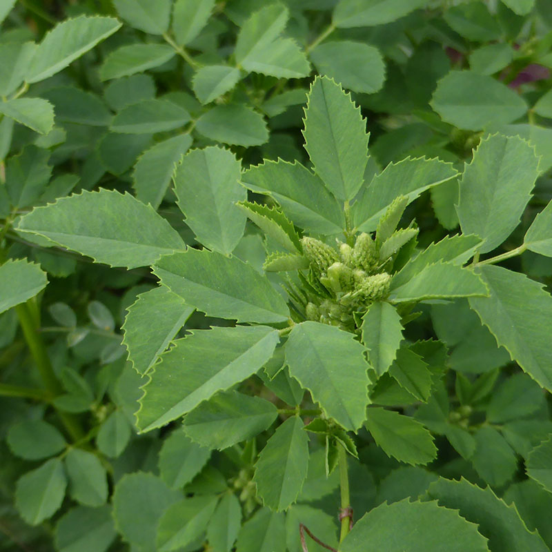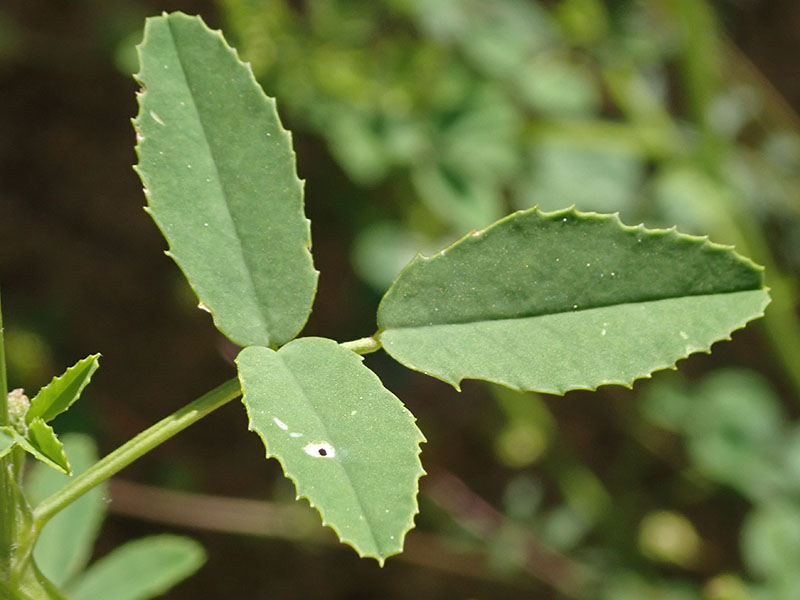 Feuilles composées, alternes, formée de trois folioles oblongues, dentées