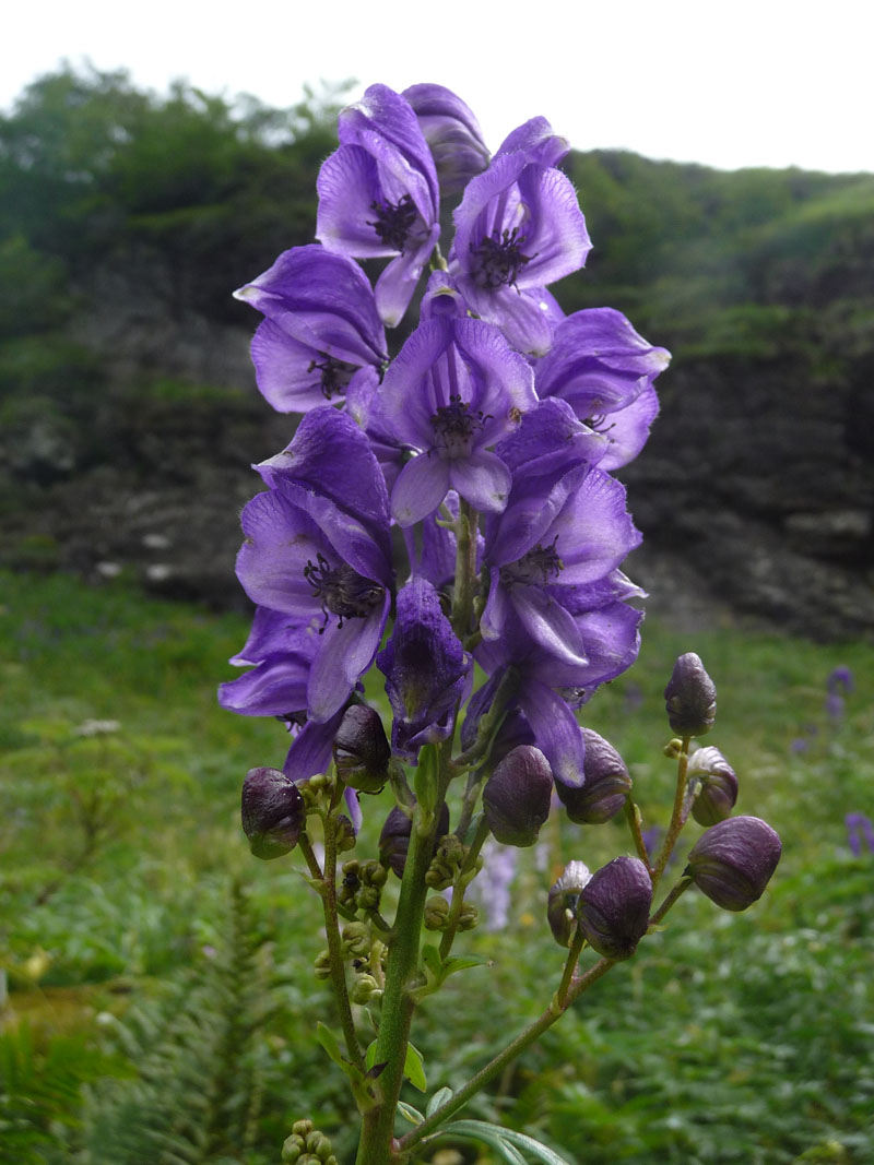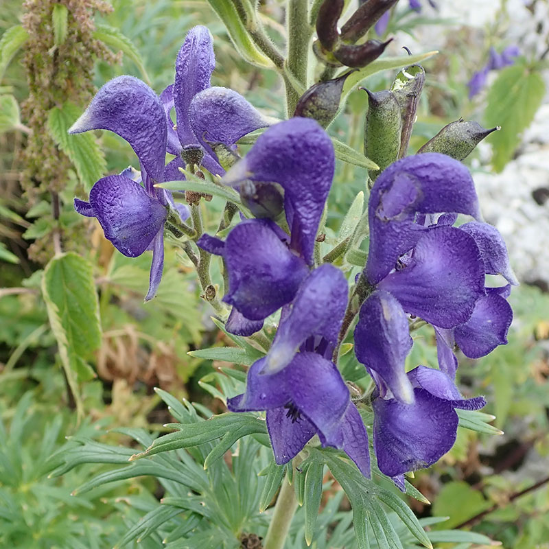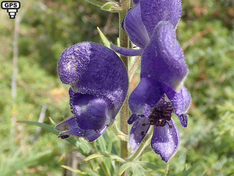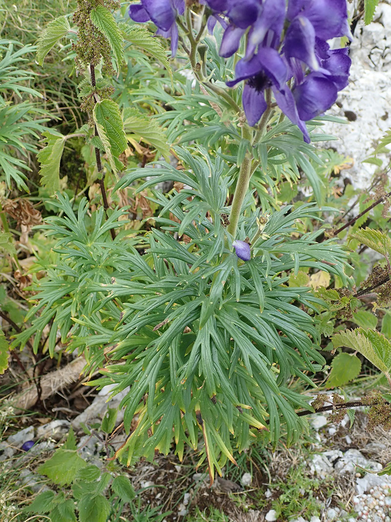 L'aconit napel est une plante vivace appréciant les bois etles prairies humides. On le rencontre dans une grande partie de la France mais surtout en montagne et plutôt sur sol calcaire et humide, souvent en groupe. Il produit des tiges atteignant un ou deux mètres de hauteur, très feuillées à la base, simples ou rameuses. Ses feuilles ont leurs divisions principales elles-mêmes divisées en lobes linéaires ou lancéolés. Les fleurs, disposées en grappes allongées et serrées, sont bleues tendant vers le violet ; elles sont tenues par des pédoncules dressés. Le sépale supérieur, en casque, est plus large que haut et sa courbure est arrondie; il est couvert de petits poils en dehors, surtout vers le sommet; les deux pétales supérieurs présentent un éperon peu courbé; les filets des étamines sont poilus. La plante emmagasine des substances de réserve dans quelques racines adventives renflées en tubercules ovales allongés, lesquels portent chacun un bourgeon à leur partie supérieure. Le premier tubercule est formé par la base de la tige et par une partie de la racine.Plante utilisée pour soigner les rhumatismes articulaires. Très toxique.
