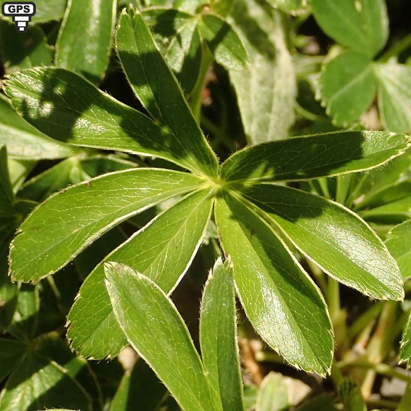 Feuilles Palmées, palmatiséquées, luisantes et glabres au-dessus, velues blanchâtres en dessous avec de 5 à 7 folioles lancéolées dentées au sommet