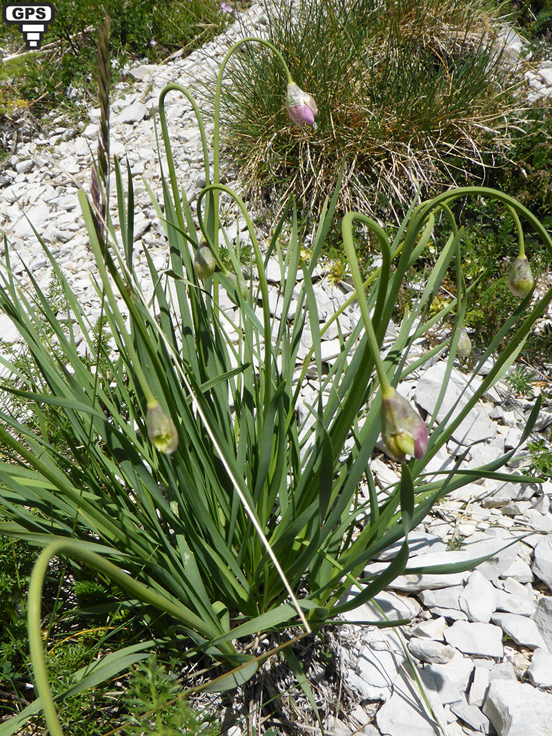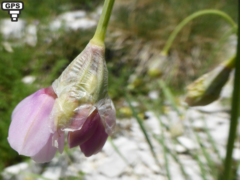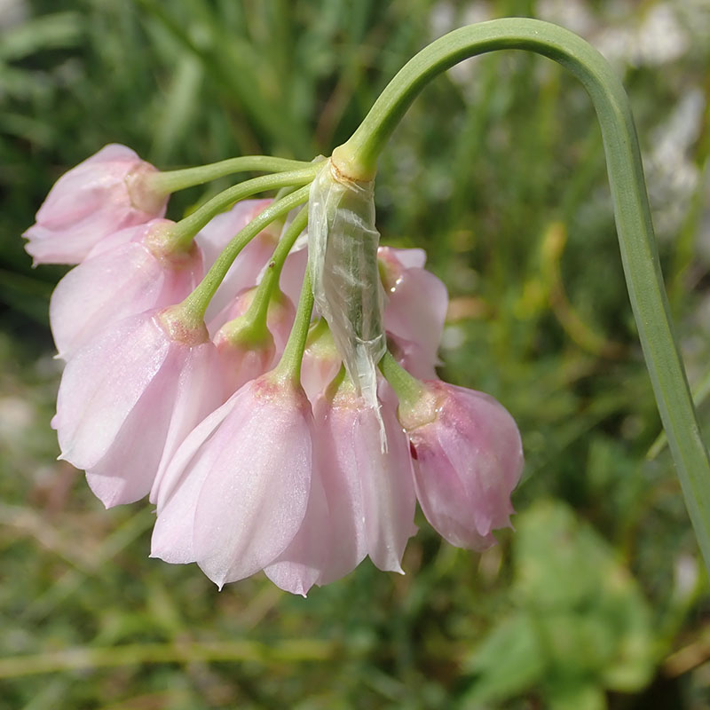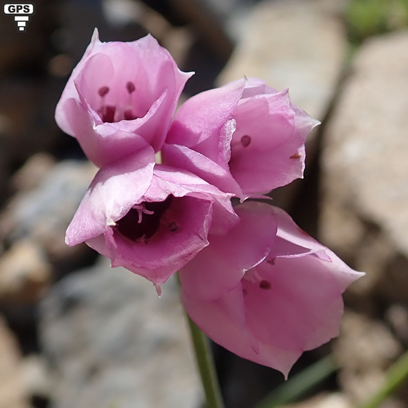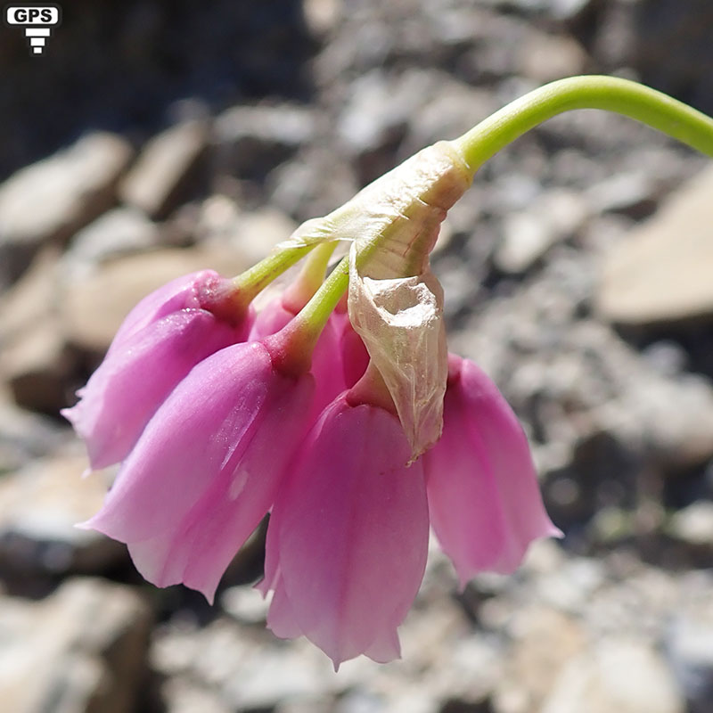 Cette plante vivace à grandes fleurs roses croît en France dans les éboulis des régions élevées des Alpes du Sud sur substrat calcaire. Elle produit une ombelle de trois à huit grandes fleurs roses retombantes entourées par une spathe scarieuse. Les tépales sont mucronés et dépassent largement les étamines et le style au stigmate trifide. Sa tige souterraine rampante est composée de plusieurs bulbes minces et allongés, pourvus d'enveloppes filamenteuses et donnant naissance chacun à une tige fleurie, dressée, plus longue que les feuilles.