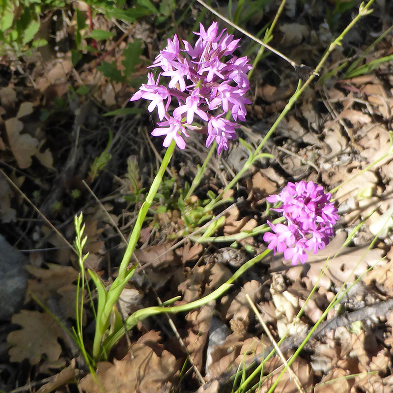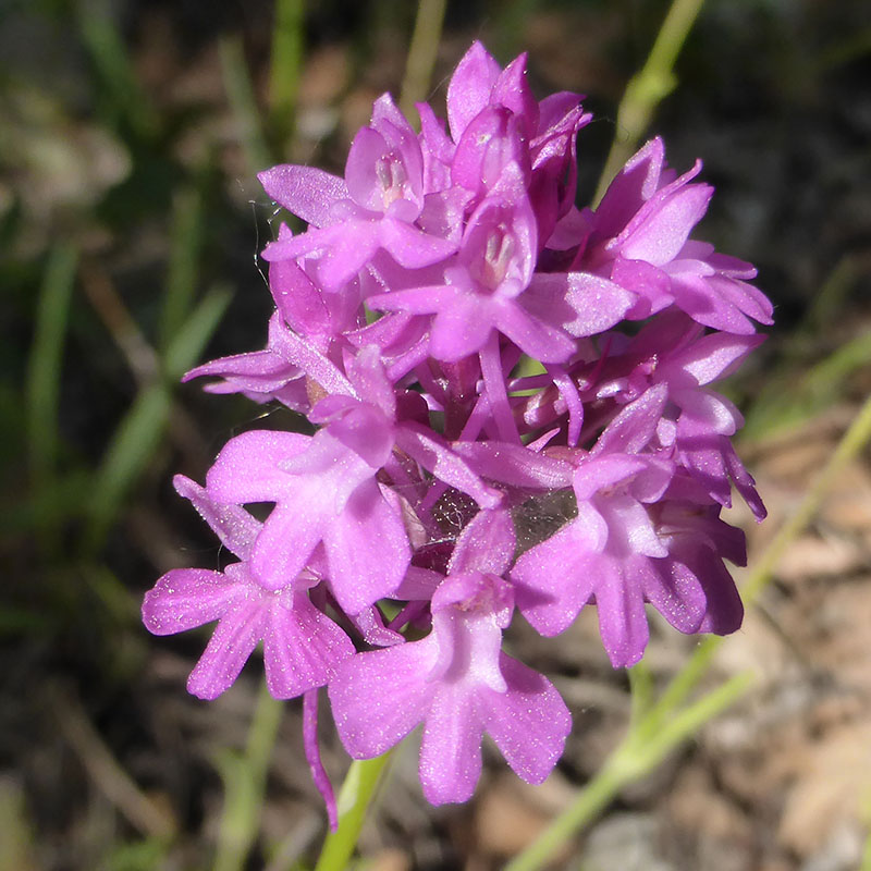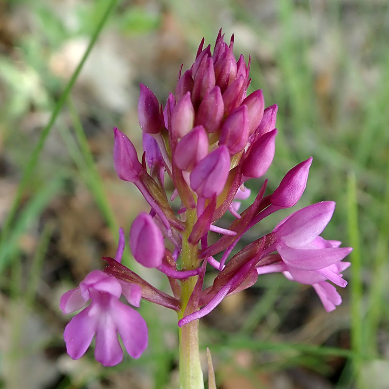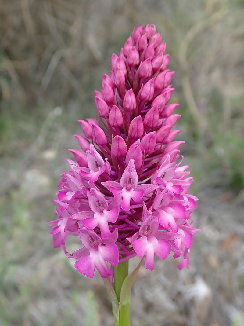 L'orchis pyramidal est une plante vivace glabre et grêle que l'on rencontre dans les bois clairs, les prés et les endroits herbeux. Les feuilles sont vert-clair, étroites, engainantes à la base, les inférieures très allongées et aiguës, pliées en gouttière en dessus, les supérieures de plus en plus réduites. Il produit un épi conique ou plus rarement ovoïde de fleurs roses à labelle étalé, plus large que long, composé de trois lobes presque égaux avec à la base deux petites lamelles perpendiculaires plus claires. L'éperon, très mince, est orienté vers le bas de la plante. La racine principale est pourvue de 2 tubercules. Le premier porte la tige aérienne et se flétrit à la fin de la floraison, le second porte un bourgeon qui donnera naissance à la tige fleurie de l'année suivante, et aussi à un nouveau tubercule.