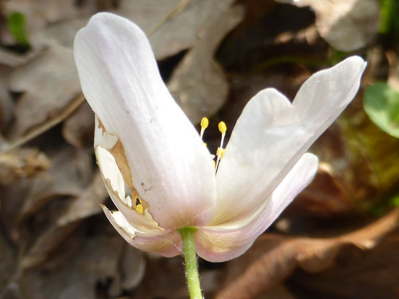 L'anémone des bois est une plante vivace très répandue dans les bois de feuillus et les clairières humides au début de printemps où elle tapisse souvent le sol. Les feuilles ont 3 à 5 divisions principales dentées ou lobées. Les trois feuilles de l'involucre ont chacune trois divisions principales dentées ou lobées elles aussi. Chaque tige fleurie ne porte qu'une seule fleur (très rarement 2) au dessus de l'involucre. La corolle des fleurs est composée de 5 à 9 sépales ordinairement blancs et un peu rosés dessous, parfois entièrement roses, très rarement pourprées ou bleues. Avant de sortir de terre, en hiver, les pétioles des jeunes feuilles et les tiges fleuries sont courbés et c'est la courbure qui apparaît en premier au-dessus du sol. La tige souterraine émet des rameaux horizontaux allongés qui multiplient la plante et qui donne son aspect tapissant à cette plante.