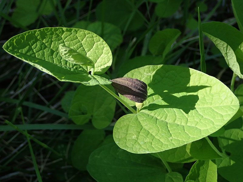 L'aristoloche à feuilles rondes est une plante vivace qui pousse croît dans les bois, les haies, les prairies et les champs pierreux du Sud de la France et beaucoup plus rarement dans le Sud-Ouest. Les tiges sont fortement cannelées, grêles, simples ou souvent rameuses, étalées et plus ou moins redressées. Les feuilles sont ovales-arrondies et en forme de coeur renversé à la base ; elles sont sessiles ou presque et embrassent la tige par deux 2 lobes rapprochés. Les fleurs sont tenues par un petit pédoncule renflé. Leur tube est jaunâtre et se termine par un grand lobe brun courbé qui ferme presque l'orifice de la corolle. L'intérieur du tube est brun sur la partie supérieure et jaune rayé de brun sur la partie inférieure. Le fruit est globuleux et pend à l'extrémité du pédoncule recourbé. Le gros tubercule arrondi de la plante donne naissance sur sa partie supérieure à des bourgeons qui perpétuent la plante. C'est une des plantes hôtes des papillons proserpine et diane.