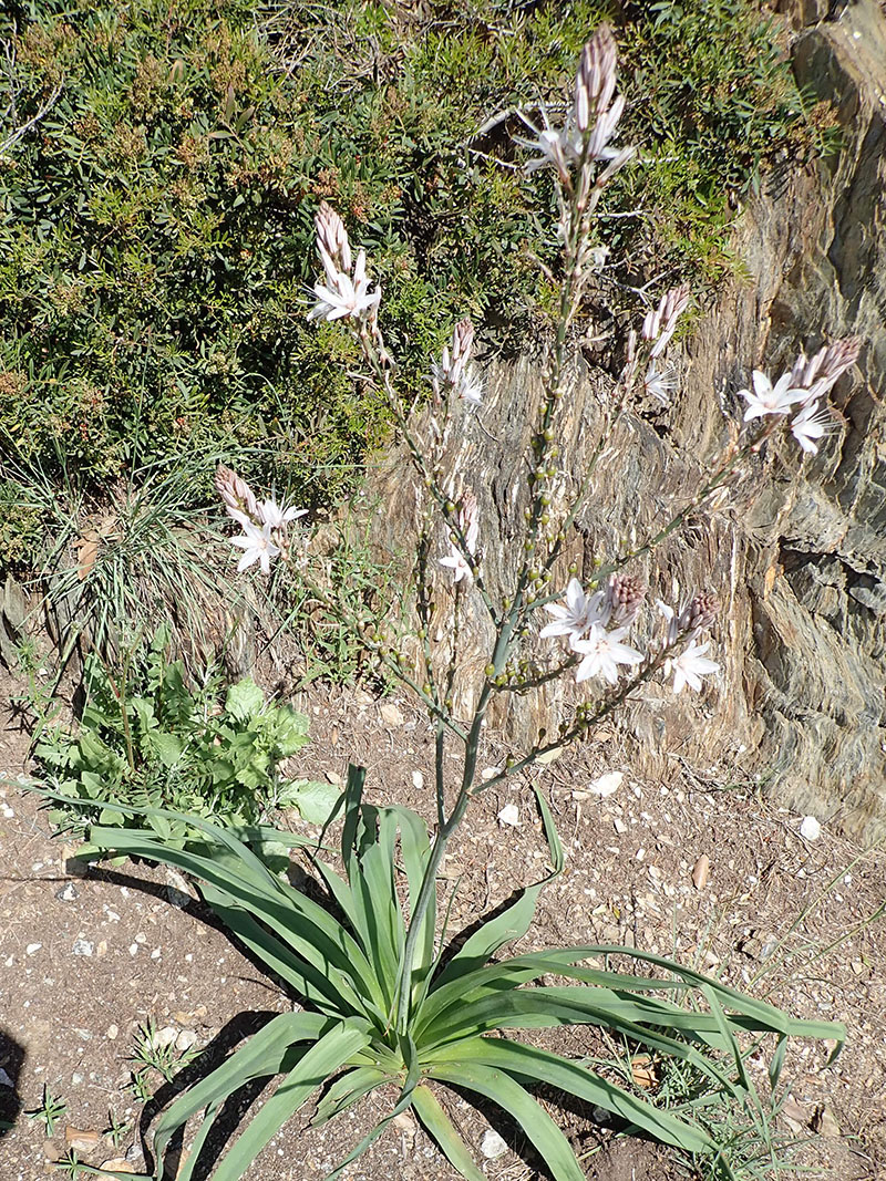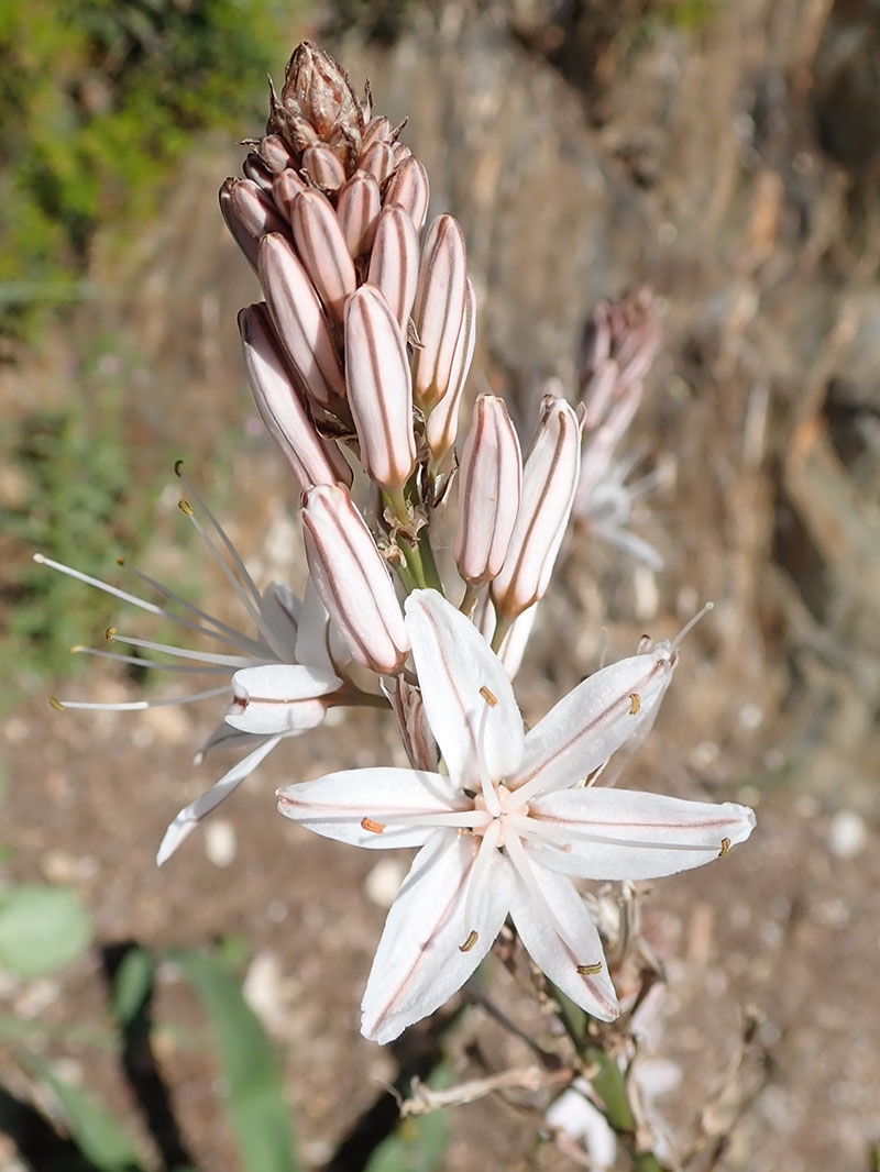 L'asphodèle ramifié produit des fleurs blanches ou légèrement rosées, veinées de brun en grappes fournies. Comme son nom l'indique, c'est une plante rameuse à rameaux presque aussi longs que l'inflorescence terminale ; elle produit de petits fruits subglobuleux plus petits que l'asphodèle blanc.