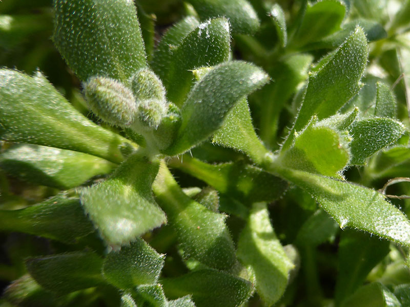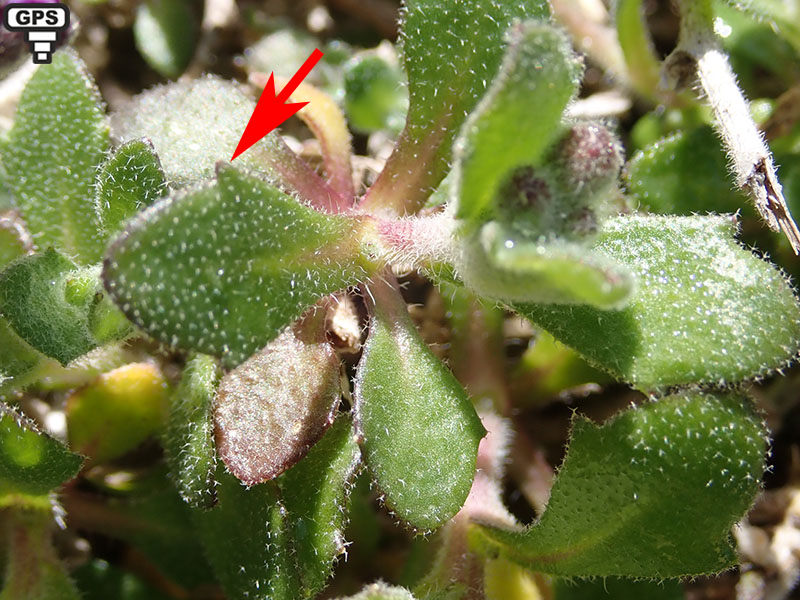 Feuilles en rosettes denses, coriaces souvent pubescentes, vert grisâtre ou brunâtre avec une dent de chaque côté.