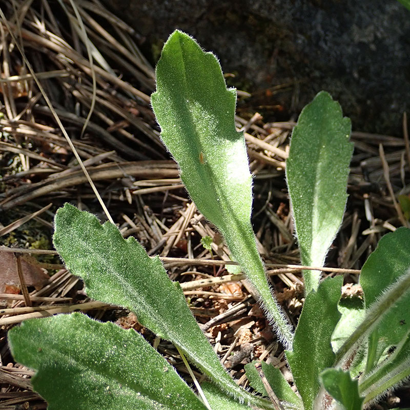 Feuilles toutes radicales obovales ou spatulées, pubescentes entières ou légèrement dentées.