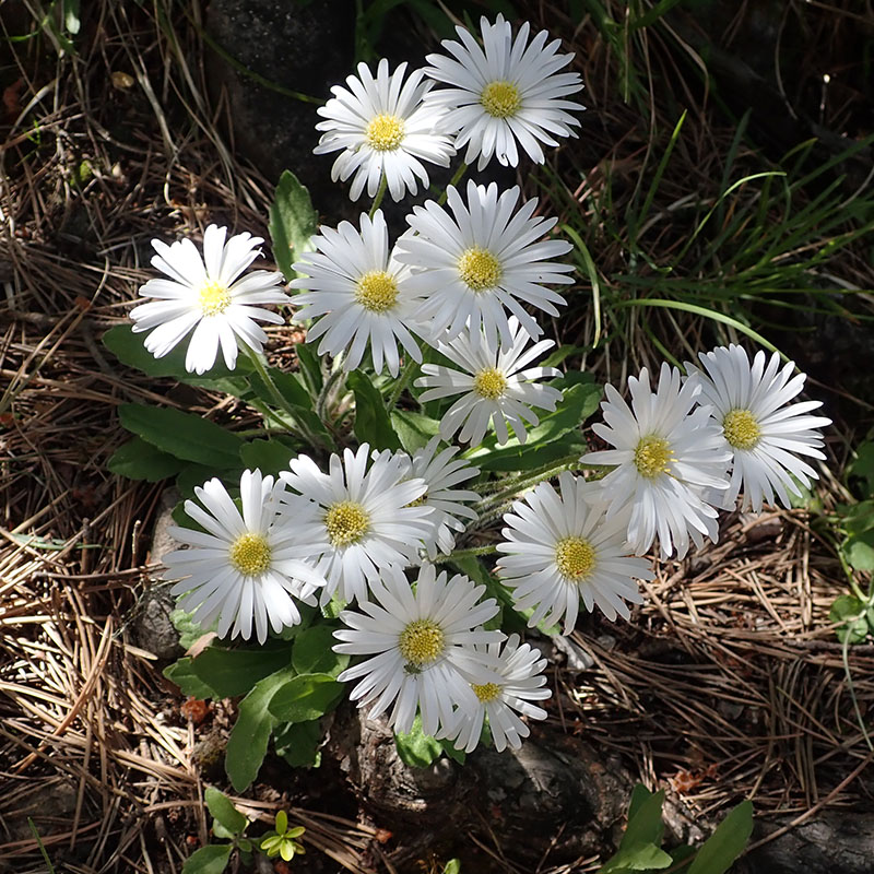 L'aster fausse pâquerette est une plante vivace à tiges dressées et plus ou moins poilues ; elle pousse sur les sols riches et humides des sous-bois et des clairières plutôt en altitude dans l'Est de la France. Les feuilles, toutes à la base de la plante, sont grossièrement dentées ou entières. Le contour du limbe est plus ou moins arrondi au sommet et atténué en un pétiole plus ou moins long. Le capitule, est composé de fleurs en languette allongée blanches ou un peu purpurines et de fleurs tubullaires jaune-pâle. L'involucre est constitué de bractées étroites, aiguës et presque égales entre elles. Les fruits sont jaunâtres, munis de petits poils raides vers le haut et surmontés d'une aigrette blanche. La plante se perpétue par des bourgeons nés sur la tige souterraine.