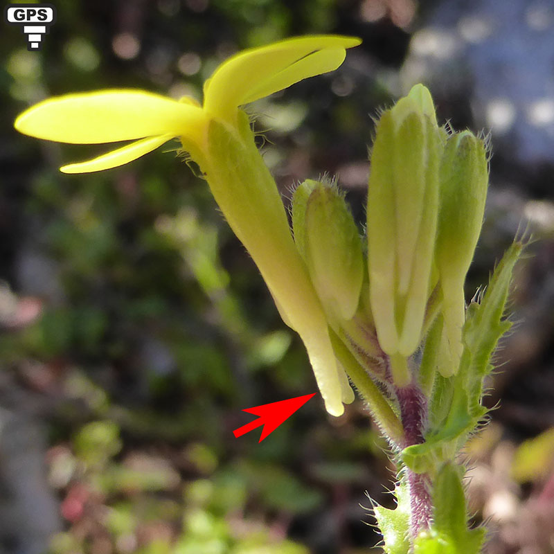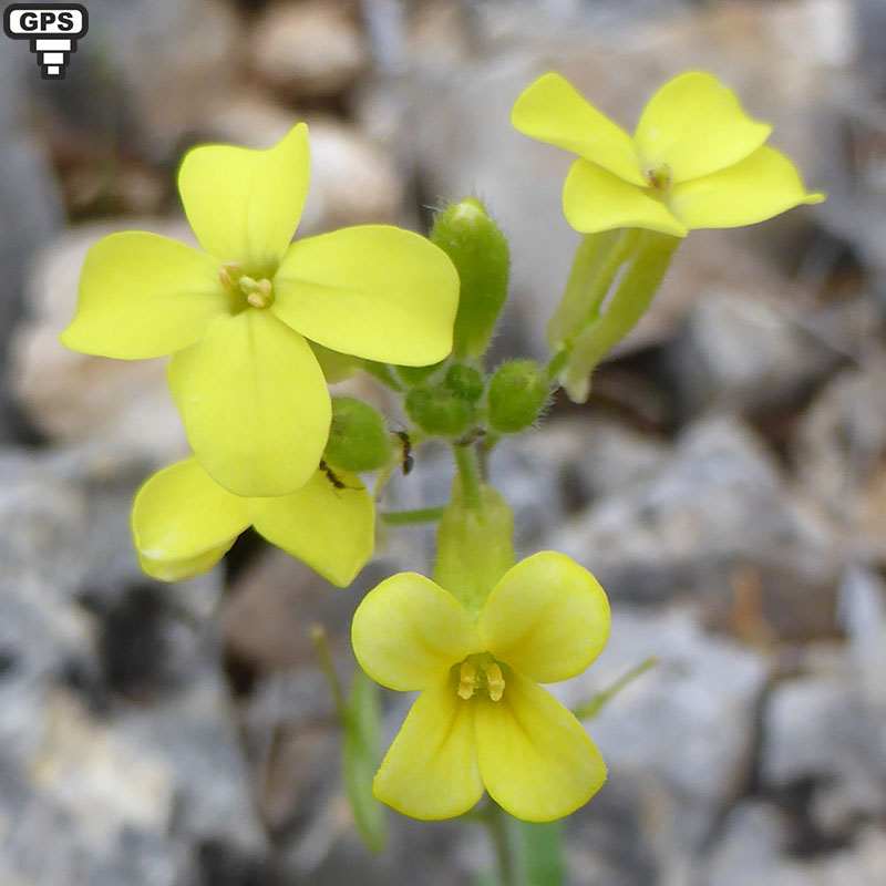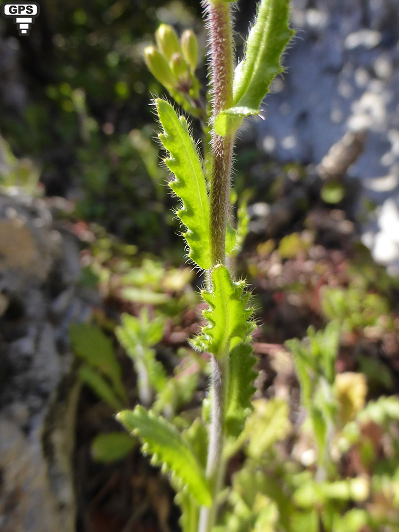 La biscutelle à feuilles de chicorée est une plante annuelle ou bisannuelle recouverte de poils blanchâtres avec de nombreuses feuilles allongées et irrégulièrement dentées réparties tout le long de la tige. Elle produit une grappe fructifère lâche de fleurs jaune citron dont deux des sépales sont prolongés en éperon à la base. On la trouve dans les zones pierreuses et sèches du Sud-Est et des Alpes du Sud.