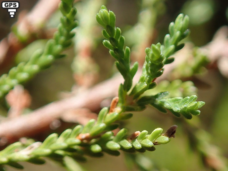 Feuilles petites, opposées, densément imbriquées sur 4 rangs, linéaires, sessiles et à 2 pointes à la base