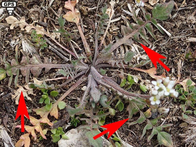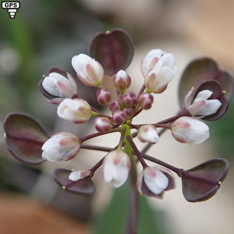Cette brassicacée est une sous-espèce de Capsella bursa-pastoris (Bourse-à-pasteur). Elle se reconnaît à ses petits fruits rougeâtres et plats en forme de coeurs qui cohabitent avec les fleurs au fur et à mesure de la croissance de la plante. Ses fleurs sont très petites et blanches regroupées en grappes allongées assez denses, les sépales sont rougeâtres ainsi que la tige et la nervure principale des feuilles au moins en partie. C'est l'une des premières plantes à fleurir en début de printemps avec sa proche cousine. On la trouve dans presque toute la France et en quantité en Provence.