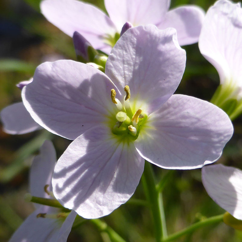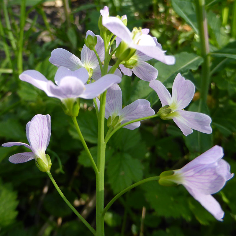 Plante des prés humides et ruisseaux, la cardamine des prés est rare dans le Midi. C’est une plante vivace à tige souterraine peu allongée portant de nombreuses racines adventives, et qui se perpétue ou se multiplie par des bourgeons adventifs produits par les feuilles. Ces bourgeons se développent dans l’eau quand les champs sont inondés ou gorgés d'eau. Elle produit un racème simple de fleurs rose pâle à quatre pétales légèrement marqués de veines plus sombres et à calice trois fois plus court que la corolle. Elle peut être la plante hôte de plusieurs papillon : l'aurore (Anthocharis cardamines), la piéride du navet (Pieris napi) et la piéride du chou (Pieris brassicae). (Photos prises en région parisienne.)