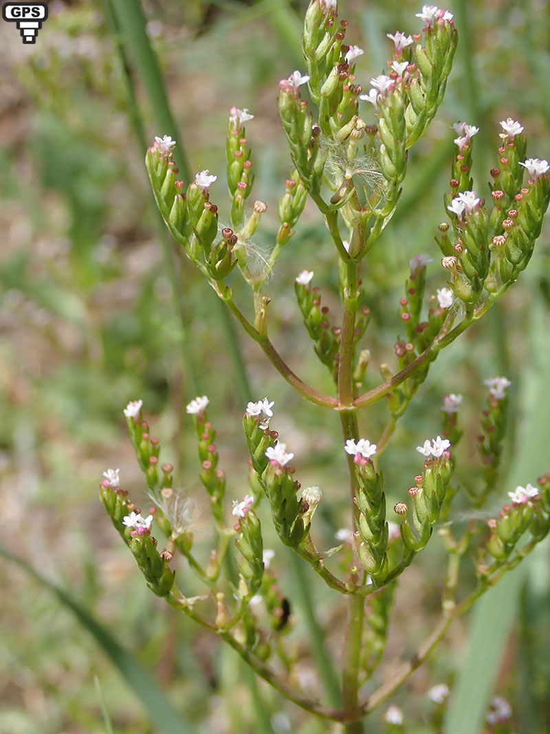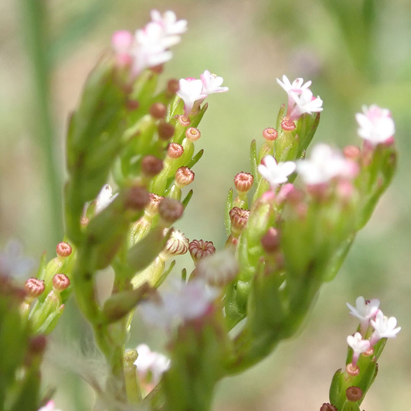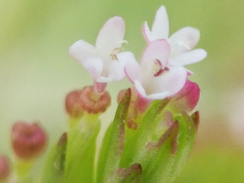 Ce centranthe à fleurs roses minuscules disposées en panicule corymbiforme pousse dans les lieux secs et arides du Midi et du Sud-Ouest de la France. La tige est dressée et cylindrique, finement striée, creuse, simple ou rameuse à la base. Les corolles à tube rose plus foncé que les lobes sont disposées sur un même côté et sont agrémentées d'un éperon à la base.