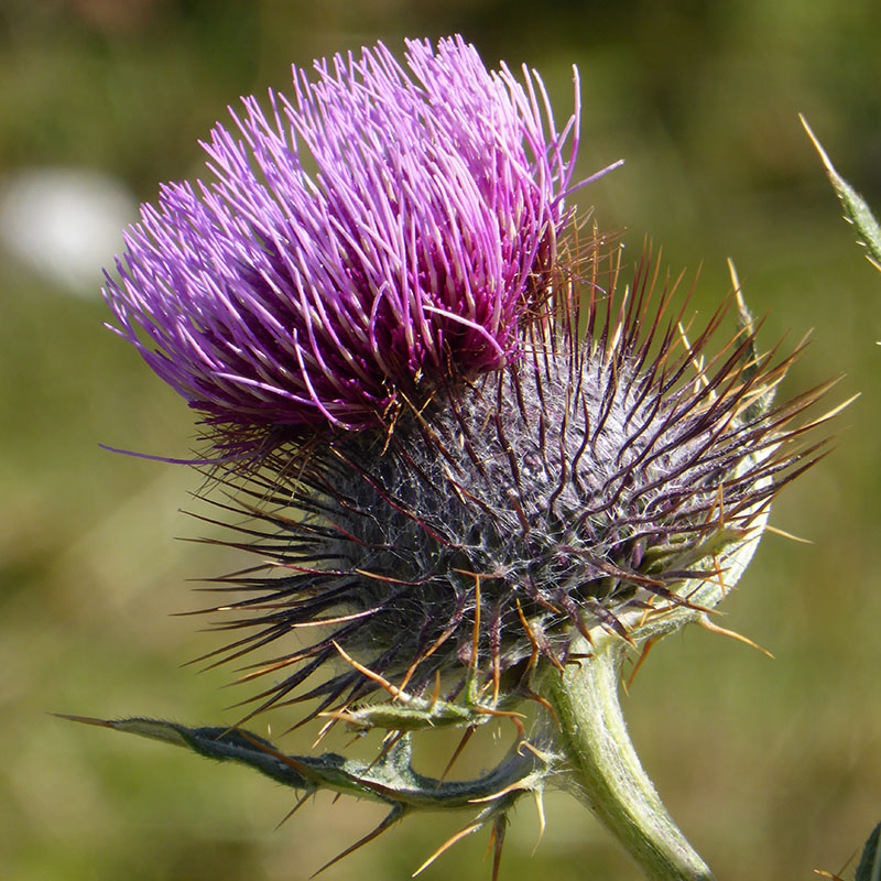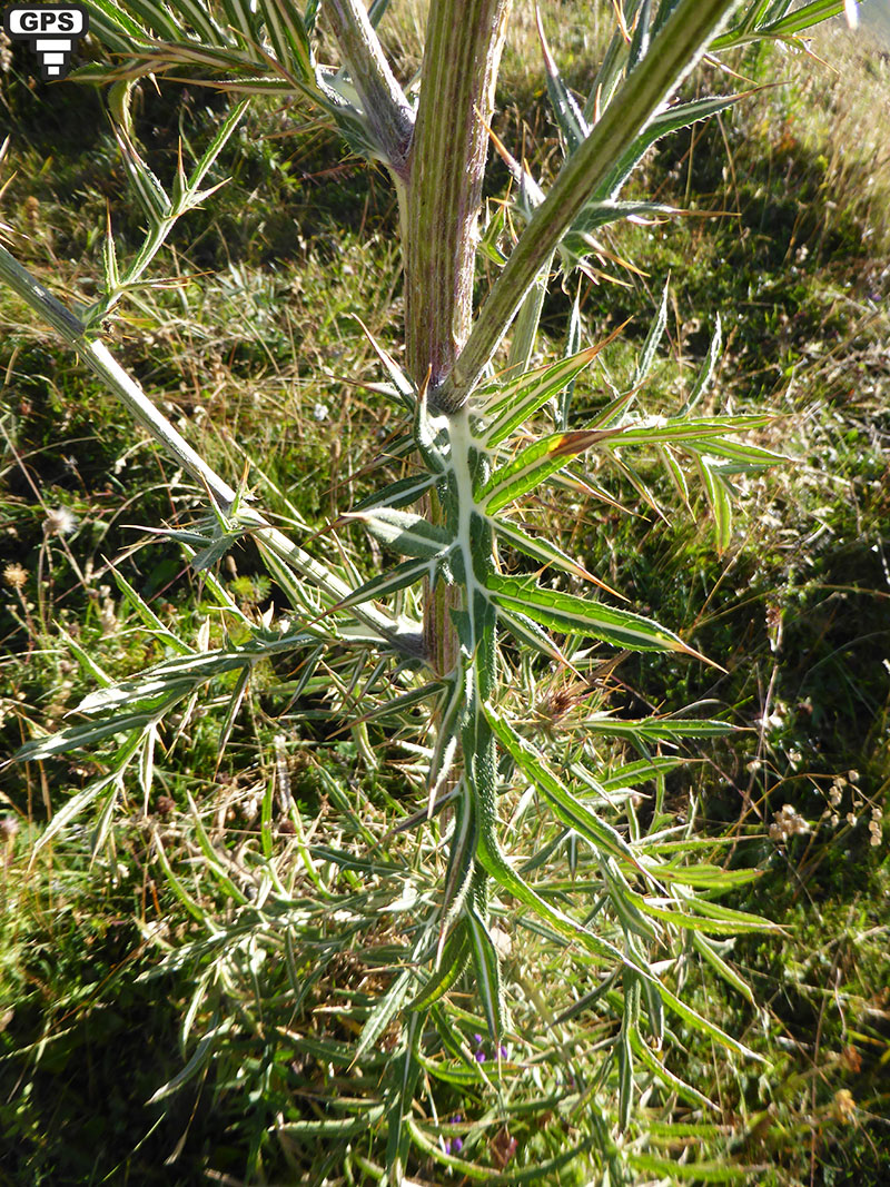 Feuilles blanches-tomenteuses en dessous, vertes et couvertes de petites épines en dessus, les caulinaires embrassantes pennatipartites à segments épineux lancéolés