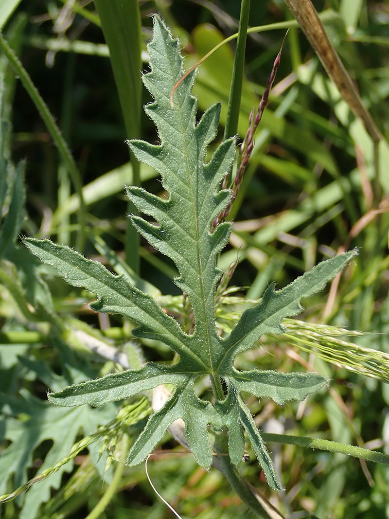Feuilles velues ou pubescentes sur les 2 faces, toutes pétiolées, les inférieures ovales en coeur, les supérieures palmatifides, avec de 5 à 9 segments inégaux, le terminal plus grand