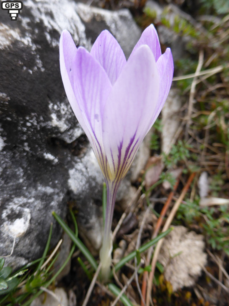 On rencontre cette espèce dans les Alpes du Dauphiné et en Provence dans les prairies et les coteaux des basses montagnes (jusqu'à 1300 mètres d'altitude). Le périanthe à tube saillant, à gorge blanche ou jaune pâle est glabre et sort de deux bractées inégales engainantes. Les sépales et les pétales présentent 3 à 5 nervures pourpres ou violettes. Les filets des étamines présentent une fine pilosité. Les stigmates orange finement dentelés, dépassent les anthères. C’est une plante vivace qui se multiplie par les bulbes, la tunique de ceux-ci est faite de fibres parallèle.