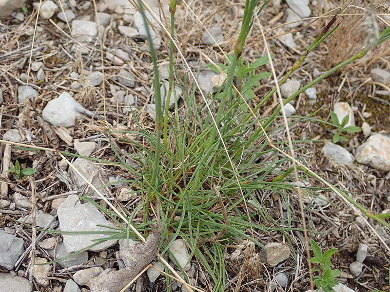 L'oeillet virginal est une plante vivace à la taxonomie complexe avec de nombreux synonymes et des descriptions assez peu précises dans les flores usuelles. On le rencontre sur une large bordure méditerranéenne sur les côteaux arides, les garrigues et même près du littoral. Les tiges florales sont fines, dressées, un peu marquées de rouge aux entre-noeuds. Les feuilles de la base forme une touffe assez dense, elles sont canaliculées. Les feuilles caulinaires, fines et aiguës sont plus courtes que les entre-noeuds. Les fleurs ne sont pas fasciculées mais tenues par un pédoncule assez long. Le calice, terminé par 5 dents triangulaires aiguës, et striés seulement vers le haut, est très allongé avec, à sa base, un petit calicule réduit à 4 bractées mucronées. Les feuilles moyennes, à 3 angles, mesurent moins d'un millimètre de largeur, en général. Les pétales roses ont des dents irrégulières sur le bord externe et sont de couleur à peu près unies.