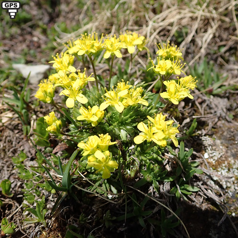 La drave faux aïzoon fait partie des plantes alpines mais on peut la trouver à des altitudes plus basses dans les zones rocheuses. Elle produit des fleurs jaunes assez grandes (compte tenu de la taille de la plante) avec quatre pétales plus longs que le calice. Les cinq étamimes sont saillantes et dépassent largement de la corolle. Les tiges florales ne portent aucune feuille, celles-ci se trouvant exclusivement à la base en rosette. Elles sont généralement bordées de cils raides. Les fruits sont placés au sommet des pédoncules qui forment un angle aigu avec la tige. C'est une plante vivace à tiges à souterraines rameuses dont les ramifications portent des rosettes de feuilles successives (au-dessous de la rosette de feuilles de l'année, on voit encore les feuilles de l'année précédente.