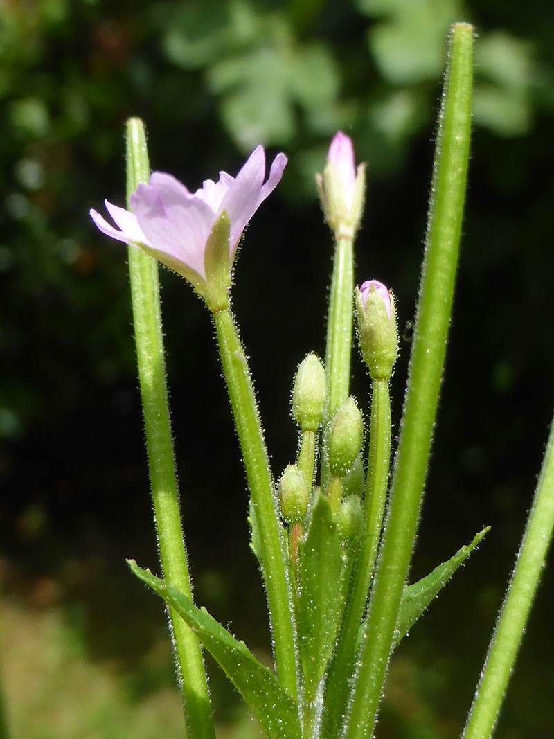 Plante vivace avec une rosette basale pérenne, l'épilobe cilié est originaire d'Amérique du Nord. Sa très petite corolle à quatre pétales est rose clair avec des lignes longitudinales plus foncées. Sa tige dressée n'est pas ramifiée. Les tiges de la plante sont recouvertes d'une fine pilosité glanduleuse.