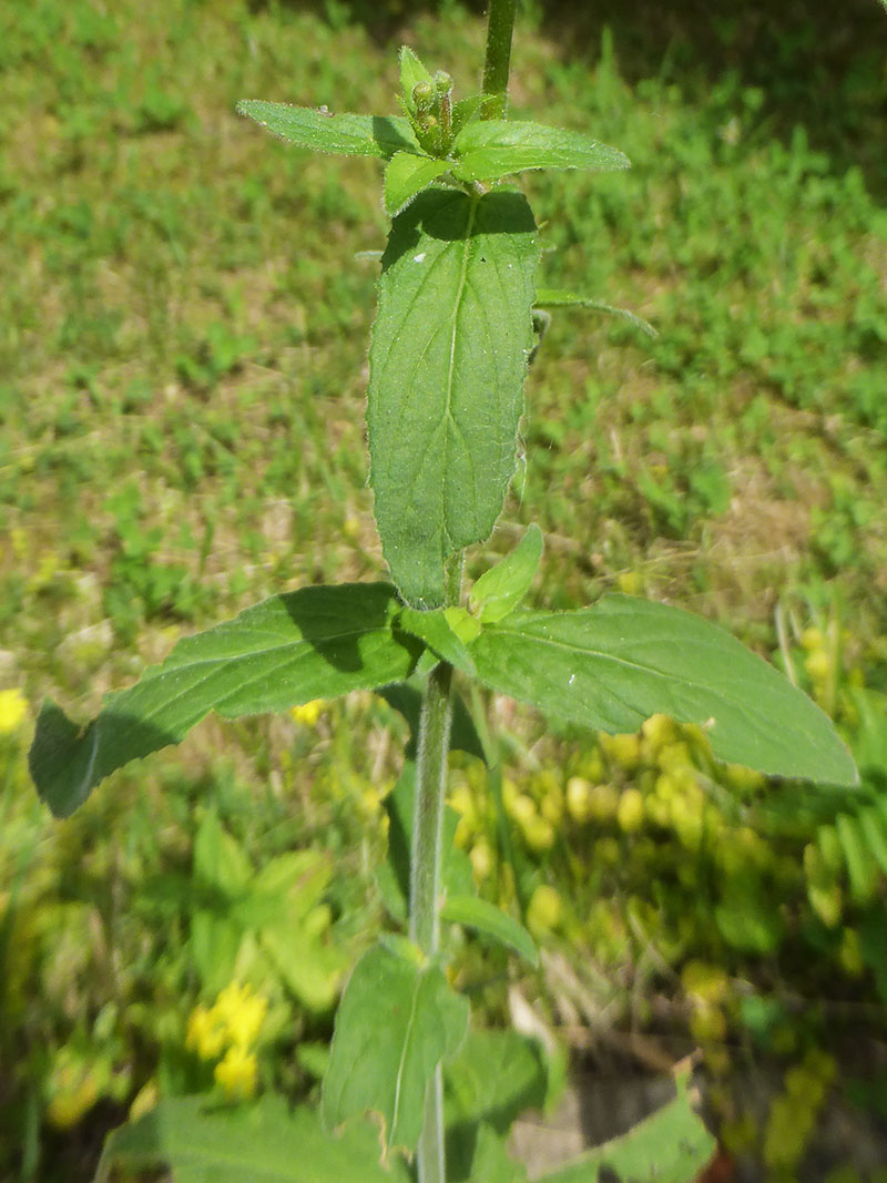 Feuilles en rosette basale et opposées sur tige avec un pétiole très court et un limbe lancéolé légèrement denté.