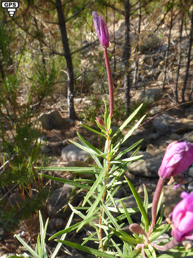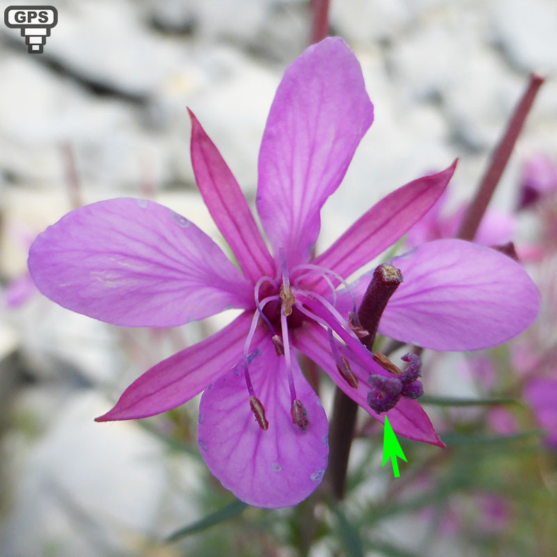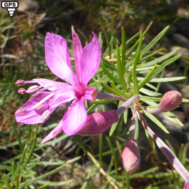L'épilobe à feuilles de romarin égaient par ses belles fleurs rose-vif, les éboulis des rochers, les talus, les bord des cours d'eau, surtout dans les régions de moyennes montagnes. C'est une plante vivace, à tiges et feuilles revêtues de poils fins et courts plus rarement la plante est toute recouverte de poils qui la rendent blanchâtre. Les feuilles sont toutes alternes, étroites (au moins 6 fois plus longues que larges) avec une nervure longitudinale. Les fleurs sont disposées en grappes courtes et toutes insérées à l'aisselle des feuilles. Les quatre pétales écartées laisse les sépales acuminées apparents. Les étamines et le style sont penchés en avant de la fleur et les quatre stigmates sont recourbés en dehors du style, lorsque la fleur est épanouie. Le style, qui est velu dans son tiers inférieur, mesure à peu près la même longueur que les étamines lorsque la fleur est complètement ouverte. Les fruits sont couverts de petits poils qui leur donne un aspect blanchâtre. La racine principale persiste longtemps, et la plante se perpétue et se multiplie par des rejets provenant de bourgeons adventifs nés sur les racines.