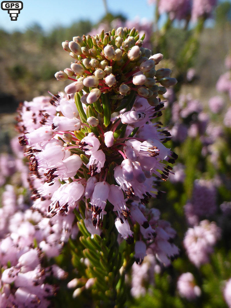 La bruyère à fleurs nombreuses est un sous-arbrisseau des bois et des côteaux secs de la région méditerranéenne plutôt en milieu basique ; on la trouve souvent dans les garrigues près des côtes. Elle produit de nombreux rameaux glabres et dressés, comme couverts d'une fine poussière. Les inflorescences sont de grandes grappes bien fournies de fleurs roses aux anthères brunâtres. Celles-ci dépassent nettement de la corolle. Chaque fleur est portée par un pédicelle très fin deux à trois plus long que la corolle. Le calice est profondément divisé et il atteint presque la moitié de la longueur de la corolle ; ses divisions sont ovales-allongées et aiguës à leur sommet. La corolle rose est en forme de cloche allongée et se termine par des lobes larges et peu profondément séparés les uns des autres. Les étamines dépassent longuement la corolle ainsi que le style, plus long encore que les étamines.