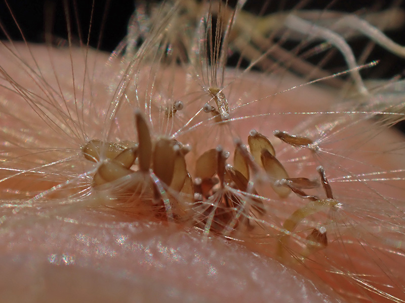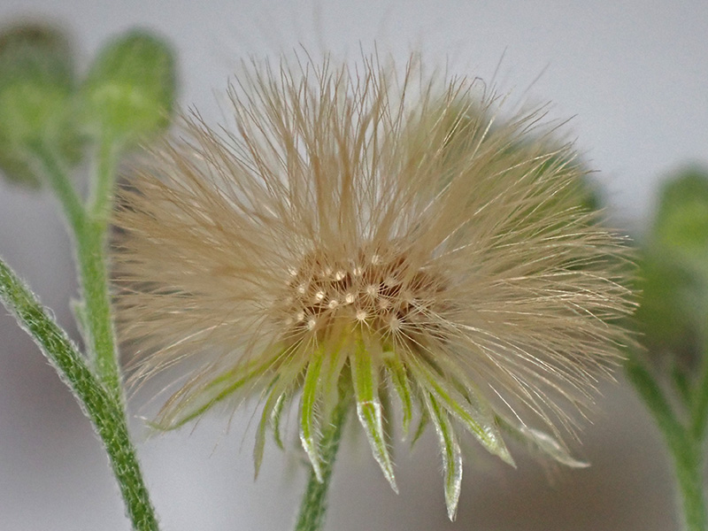 Fruits minuscules (de 1 mm à 1,5 mm) akènes à aigrette beige avec des soies filiformes