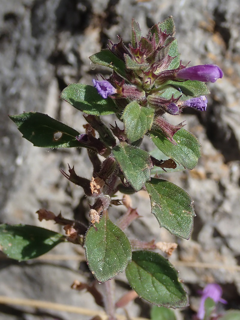 Le calament des Alpes est une petite plante vivace poussant sur les rochers et sur les pentes pierreuses des montagnes clacaires. Elle produit une ou, le plus souvent, plusieurs tiges fleuries avec des feuilles au limbe ovale, un peu denté dans la partie supérieure. Les fleurs sont groupées par 2 à 4 en verticilles axillaires assez distants les uns des autres, sauf au sommet des tiges fleuries. Le calice est bossu vers sa base, velu, un peu courbé, rétréci au-dessous de ses 5 divisions ciliées. Le tube de la corolle bleu, mauve ou violette dépasse le sommet du tube du calice en formant 4 lobes arrondis à son extrémité. La gorge de la corolle est taché de mauve clair. C'est une plante inodore à tiges florifères ligneuses dans leur partie inférieure et qui se perpétue par des bourgeons nés sur les ramifications de la tige souterraine.