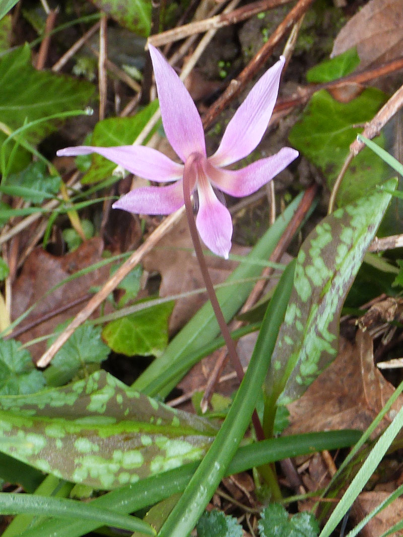 La dent de chien est une plante vivace à bulbe allongé muni d'enveloppes membraneuses ; le bulbe produisant des caïeux qui perpétuent la plante. La fleur, à la hampe florale réfléchie, est composée de six tépales allongées se redressant à la pointe, la base de ceux-ci est souvent lavée de brun jaunâtre. Les six étamines, composées d'une longue anthère rouge violet fixée par la base à un filet blanc, entourent un pistil avec un strigmate à trois branches qui les dépasse. Les feuilles au nombre de deux ou trois sont grandes et facilement reconnaissables à leur limbe brun rougeâtre taché de vert clair. On rencontre cette jolie plante peu répandue dans les bois clairs et les prairies des moyennes montagnes et des collines dans le Sud de la France (Elle aurait disparu des Hautes-Alpes). (Photos P. Nouyrigat)