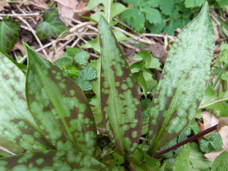 Chaque bulbe produit deux ou trois feuilles caractéristiques vert taché de brun (où l'inverse)