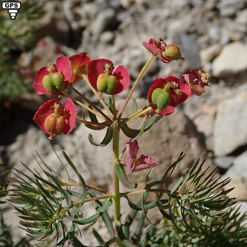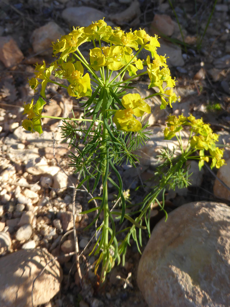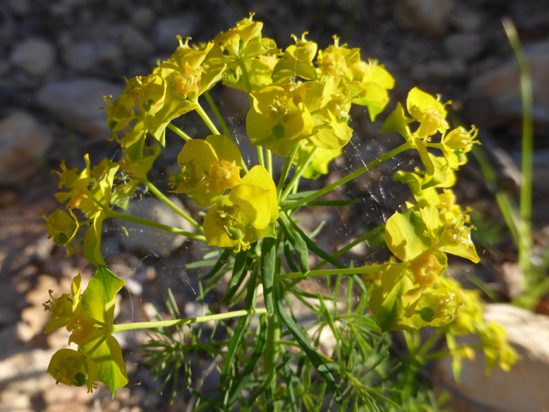 Plante vivace commune dans les terrains calcaires, dans toute la France, l'euphorbe faux cyprès produit des ombelles de petits cyathes jaunes avec des glandes en forme de croissant. Les nombreuses tiges portent des rameaux stériles sous les ombelles. A maturité de la plante, l'inflorescence prend une coloration rouge.La sève laiteuse est toxique et provoque des irritations de peau. (Wikipedia)