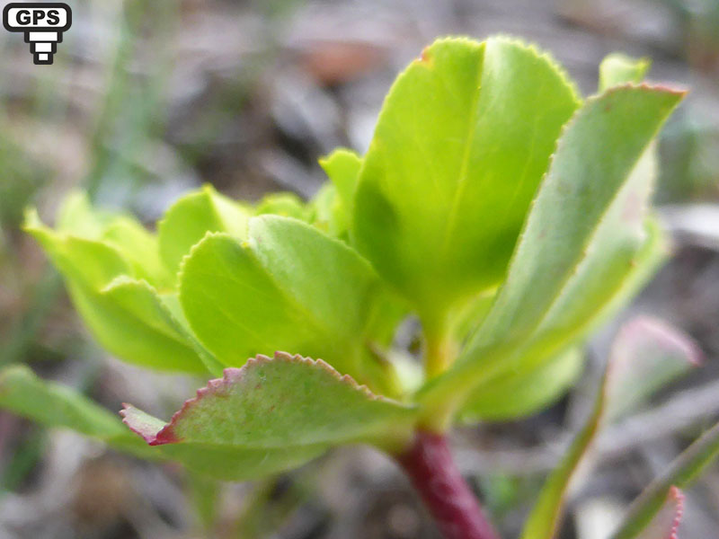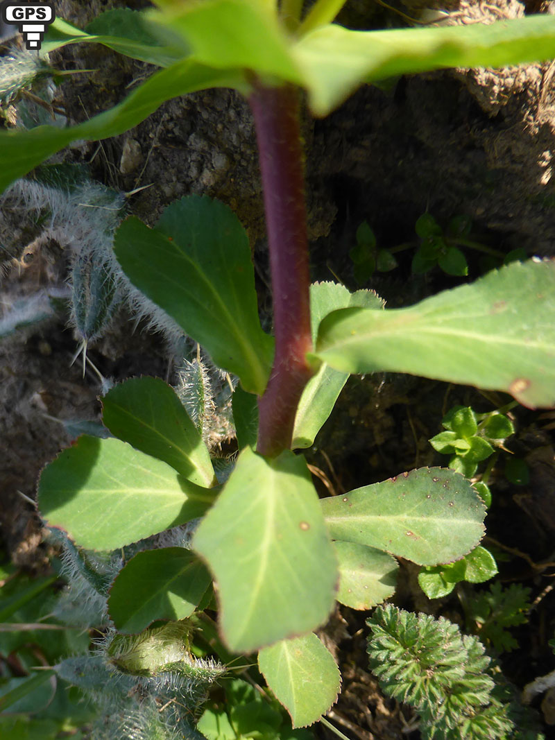 Feuilles éparses, obovales en coin, obtuses, denticulées dans leur moitié supérieure, les ombellaires plus grandes