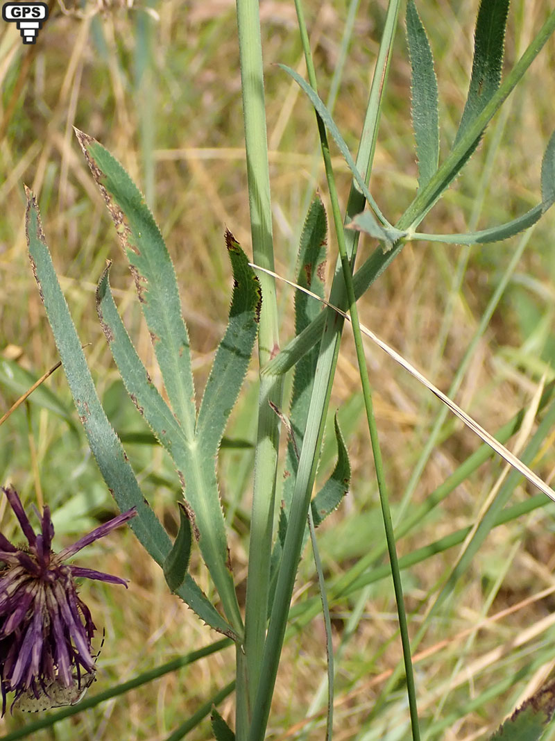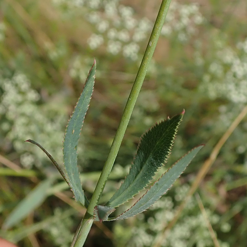Feuilles un peu coriaces, plats, les radicales simples ou ternées, les caulinaires pennatiséquées à segments linéaires et allongés, souvent courbés en faux, bordés de dents fines et terminés en pointe