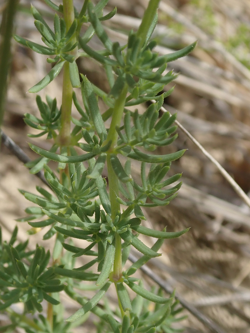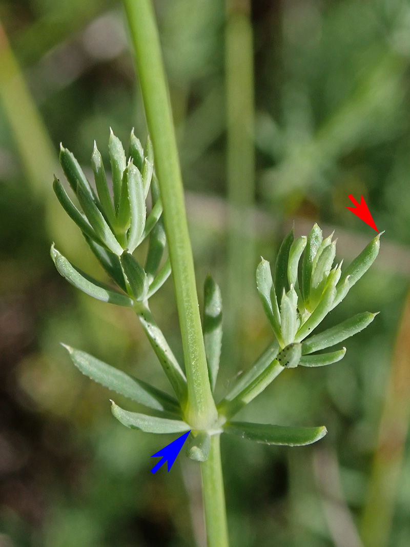 Feuilles verticillées par 6 à 8, allongées, linéaires - étroites, mucronées, à bords enroulés, scabres, glauques, à nervure dorsale saillante