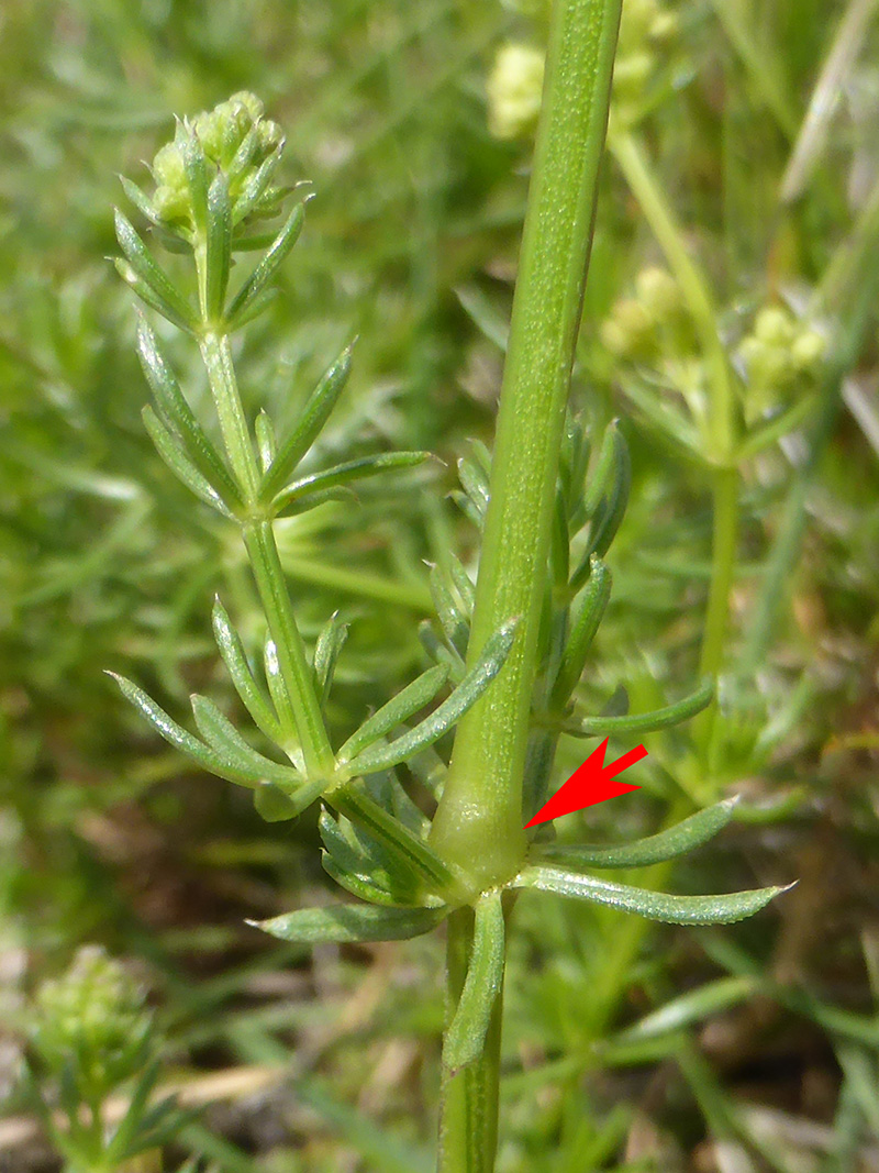 Feuilles verticillées par 6 à 8, linéaires, longuement mucronées, à nervure dorsale large et saillante