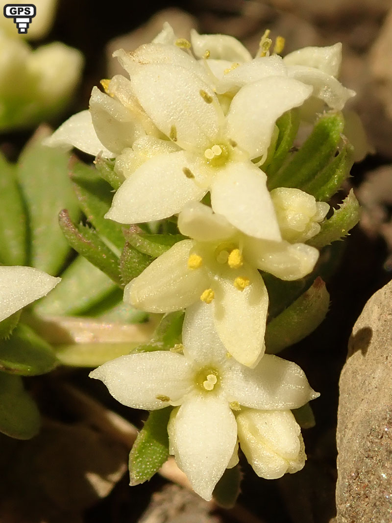 Feuilles verticillées par 5 à 6, obtuses, non ou faiblement mucronées bordées de quelques poils orientés vert l'avant
